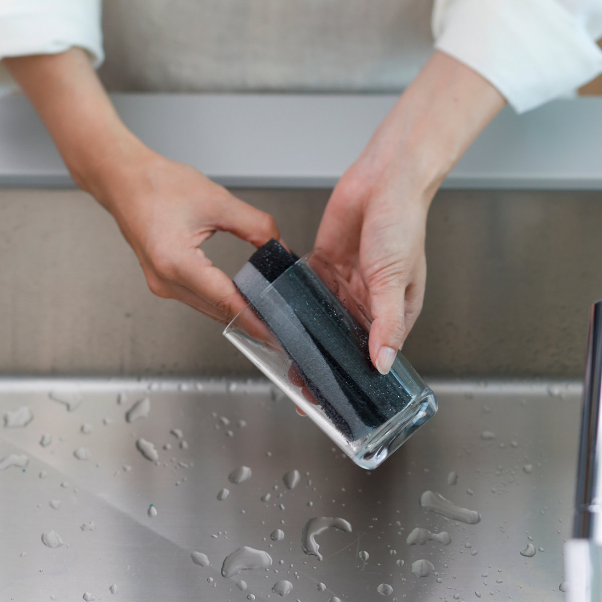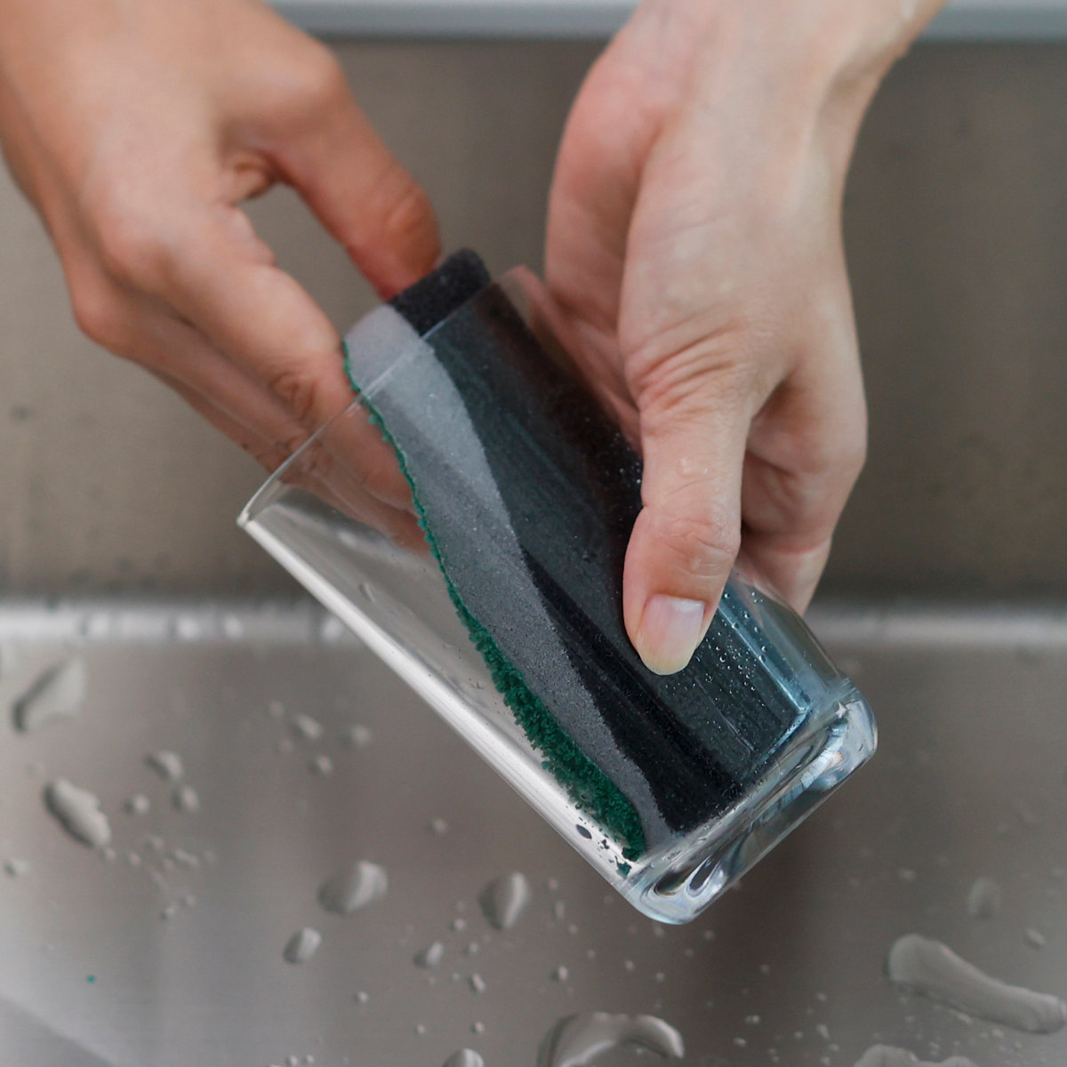 密度のあるウレタンスポンジを、ハード加工パイルで挟み込みました。スポンジにコシがあり、角やフラットな面を使ってボトルの底までしっかり洗えます。ハンドルとスポンジのハード加工面には、抗菌加工が施されています。