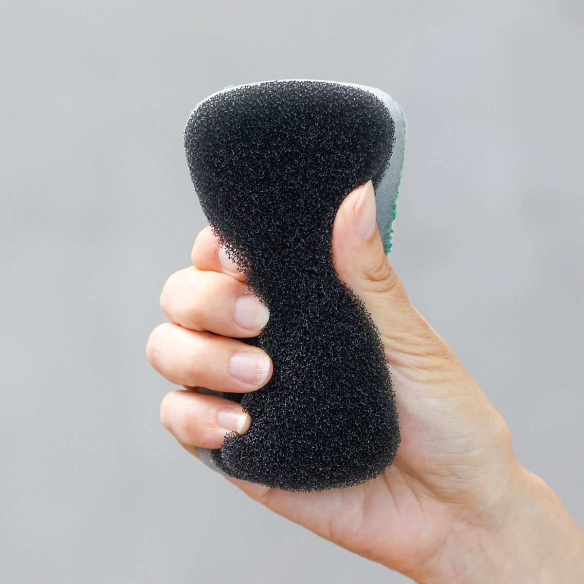 いつもの食器洗いはもちろん、こびりついた頑固な汚れまでしっかり落とせる三層構造のキッチンスポンジです。手にしっくりなじむ厚みと形状で、容器や鍋のすみずみ、角の部分にもぴったりフィットします。