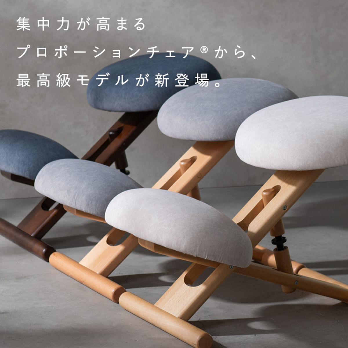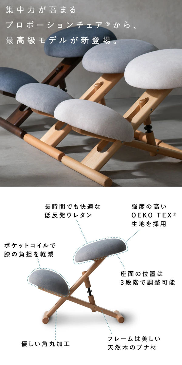 座るだけで自然と背筋が伸びる「プロポーションチェア」の上位モデル。進化した素材と構造で、座り心地・使い心地・耐久性を強化しました。機能性だけでなく、空間に調和する上質な佇まいにもこだわりました。