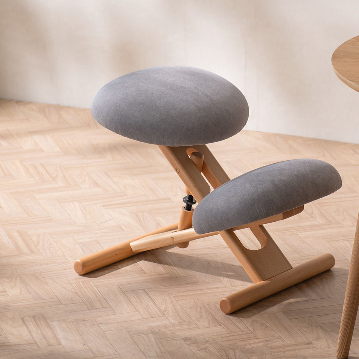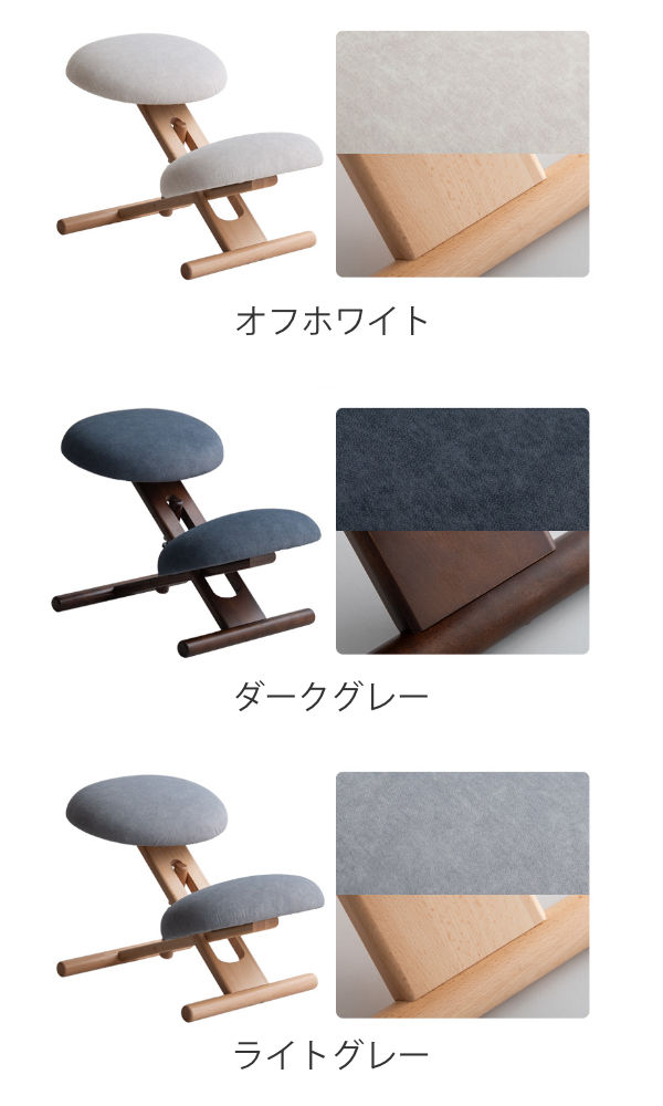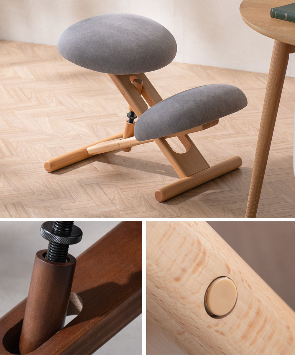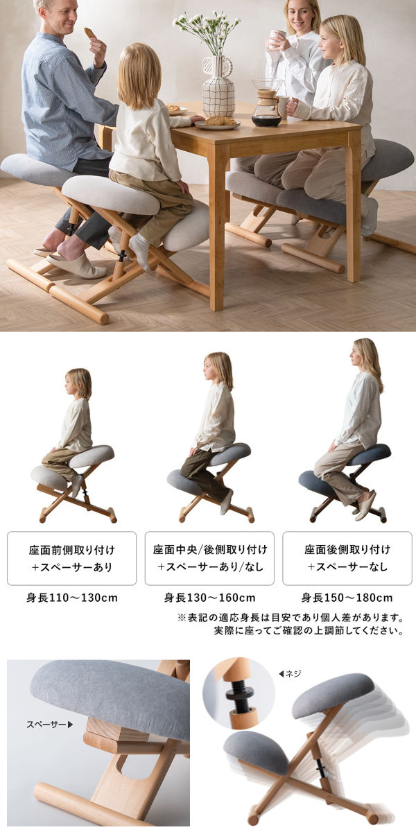 座面高さは後部ネジを回すだけで簡単に調節可能。さらに座面の取り付け位置は前後三段階から選べ、膝クッションとの距離も細かく調整できます。