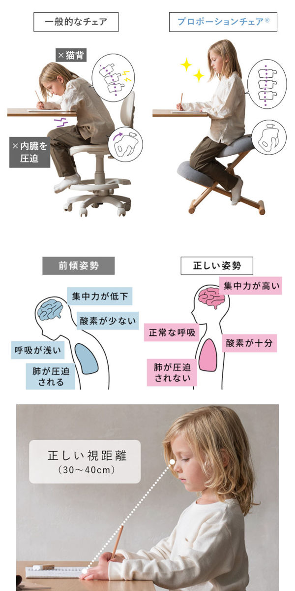 斜めに設計された座面により、立ち姿勢のように骨盤が立ち、背中は自然なS字カーブをキープ。 無理なく理想的な姿勢へ導きます。 正しい姿勢で座ることで集中しやすく、視距離(約30~40cm)も保ちやすくなります。