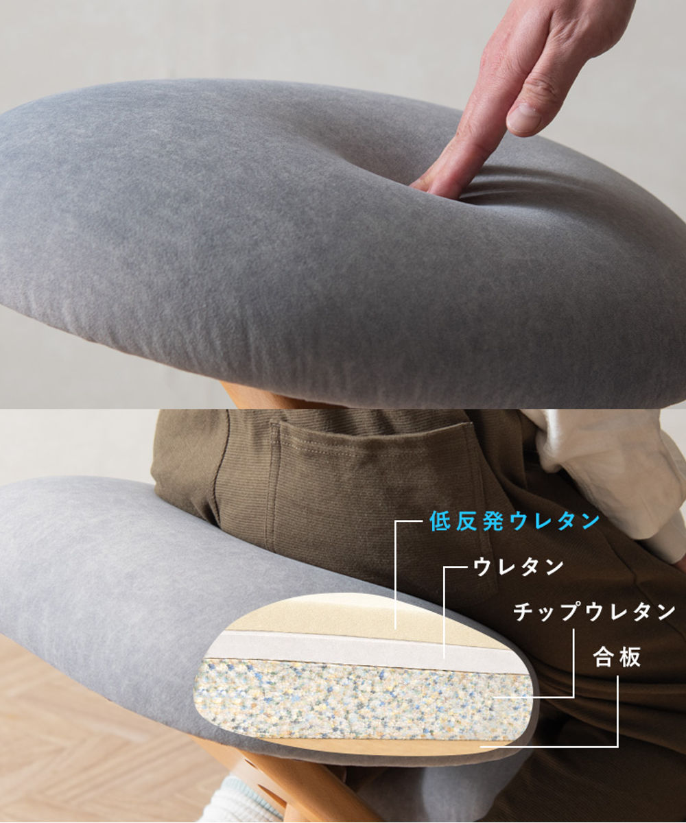 座面には低反発ウレタンを採用し体圧を分散。 弾力ウレタン+高耐久チップウレタンを重ねた三層構造で、ワンランク上の座り心地を実現しました。