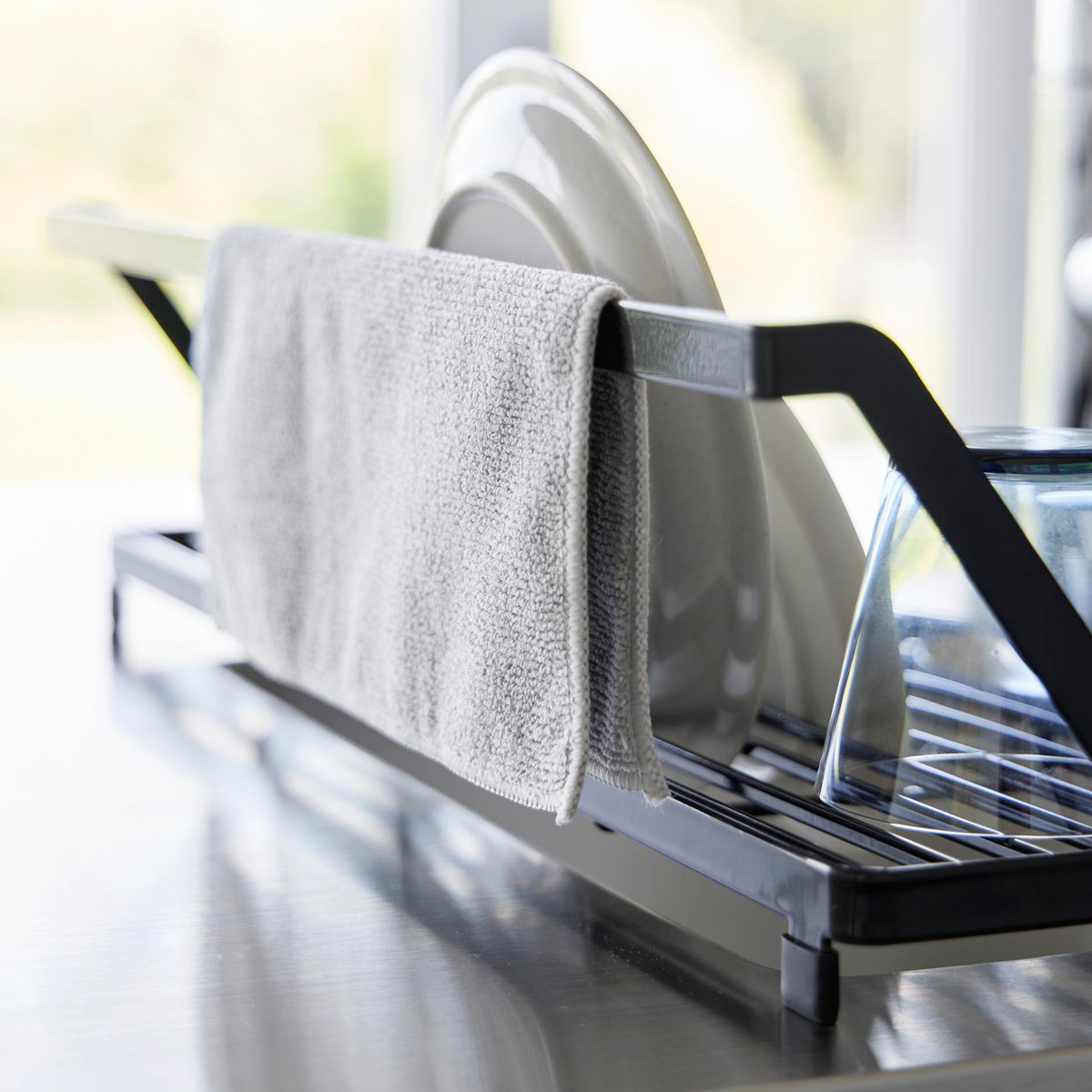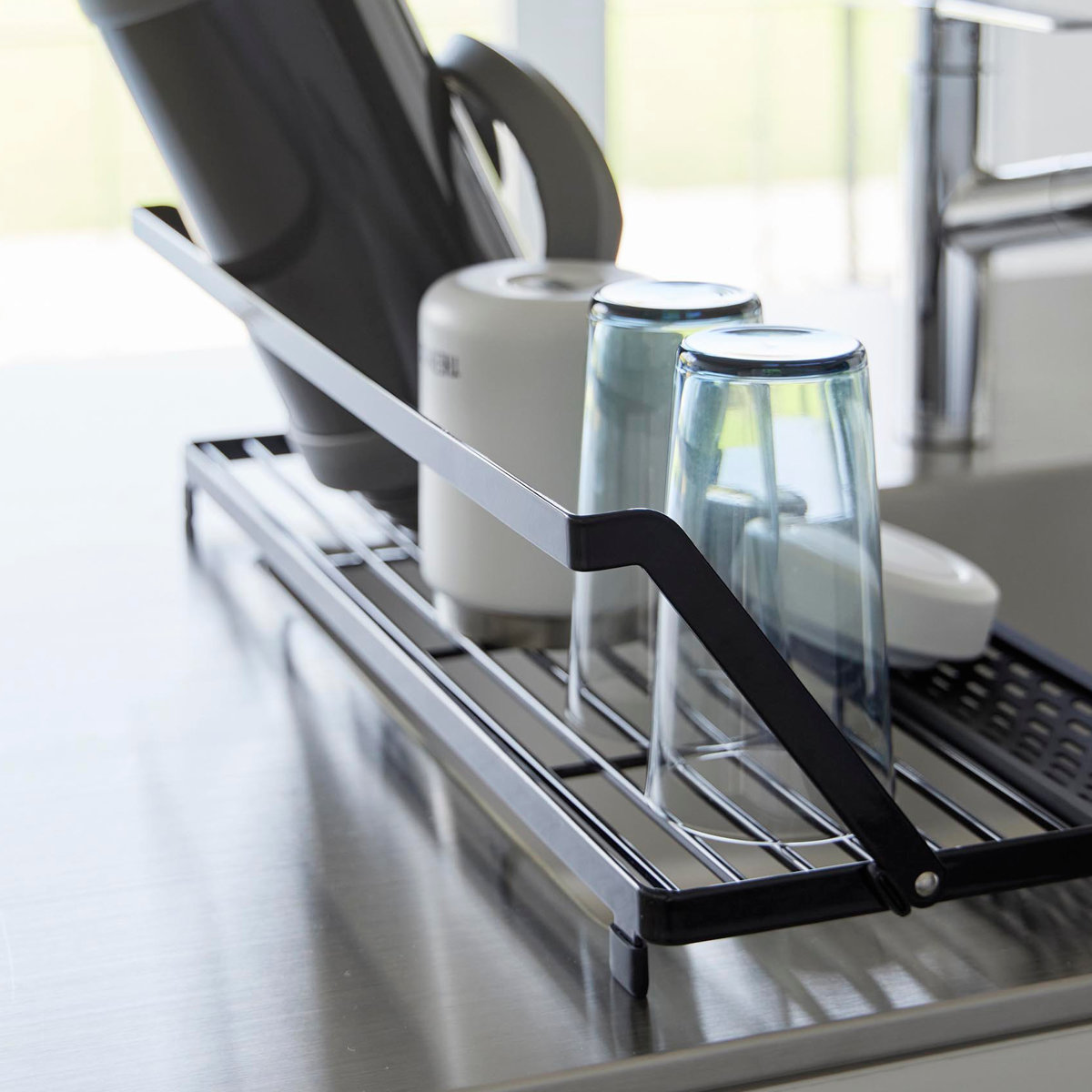 可動式スタンドバー付きの水切りラックです。バーを折り畳んだ状態で使用すると鍋やボウルなど幅のある物を乾かせます。バーを立てることで、ジャグボトルやまな板、お皿などを立てて乾かせます。食洗機に入りきらなかった食器やすぐに使いたいコップなどのサブ置き場としても活躍します。