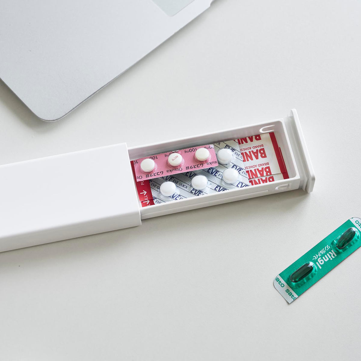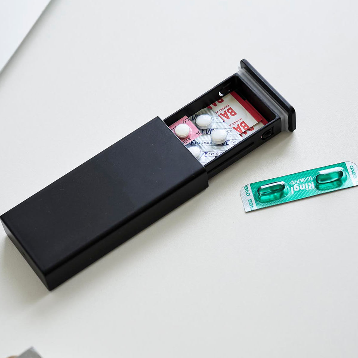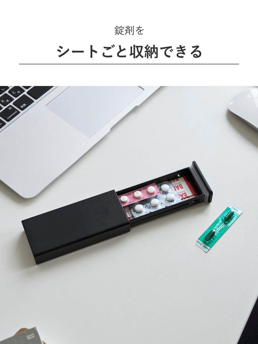 錠剤をシートごと収納できる、携帯しやすいスリムなピルケースです。絆創膏や細かなアイテムの収納にも便利です。