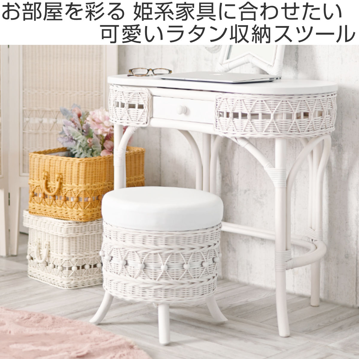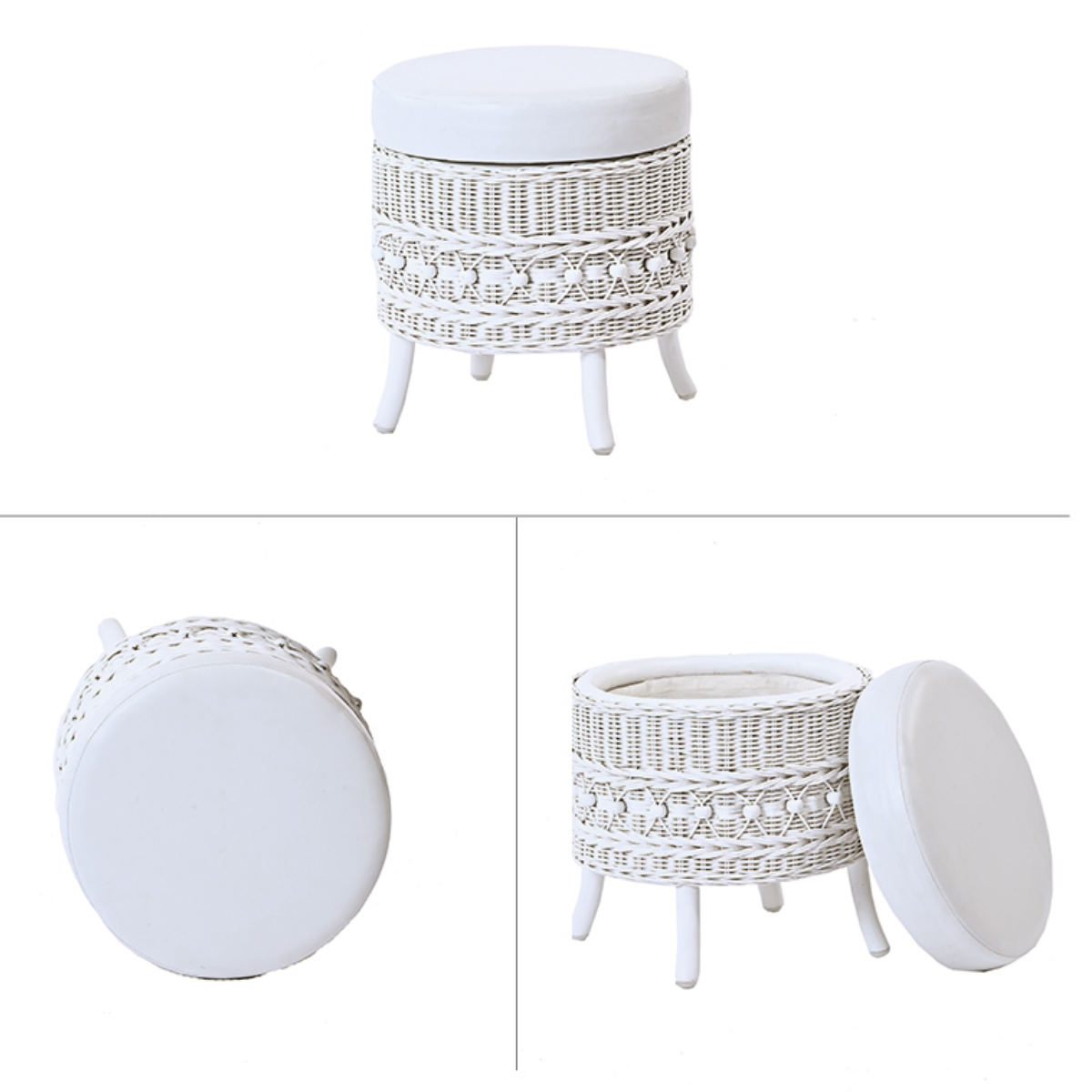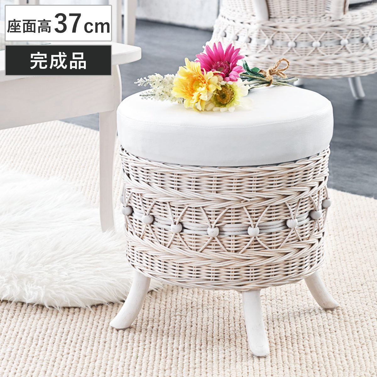 ラタン 収納付きスツール 籐製 腰掛け椅子 チェア 脚付き fiore ( 椅子 ラタンチェア スツール 円形 丸椅子 背もたれなし 完成品 収納 クッション 姫系 白家具 ガーリー ラタン家具 アジアン家具 白 ホワイト シャビーシック )
