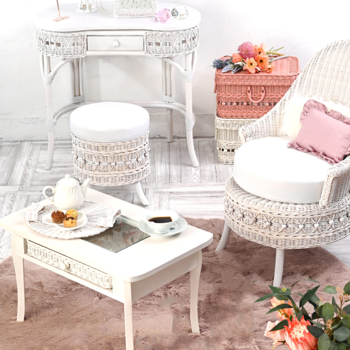 ホワイトウォッシュカラーの丸いフォルムはカントリーやガーリー、ロマンティックなお部屋にマッチします。座面クッションとのバランスもよく、置くだけで空間を明るく見せます。