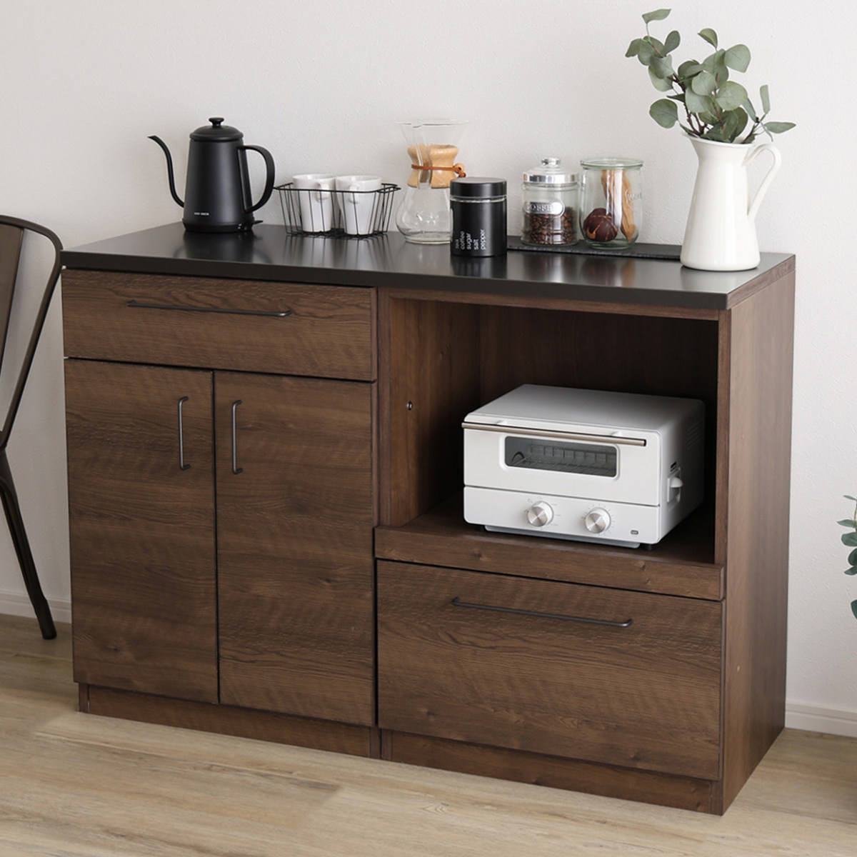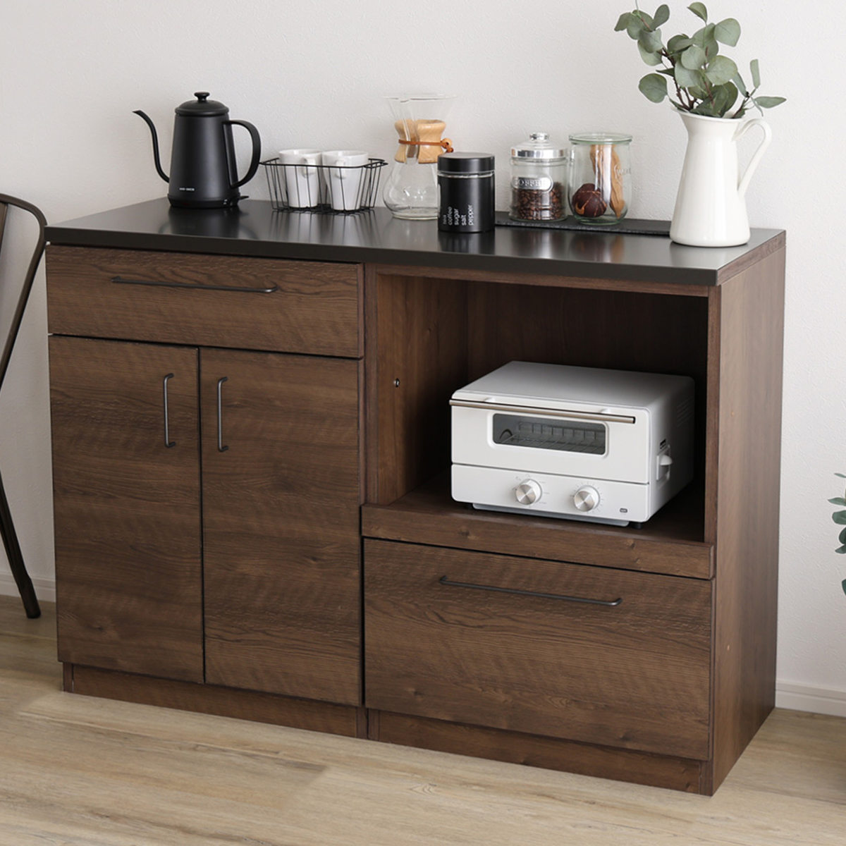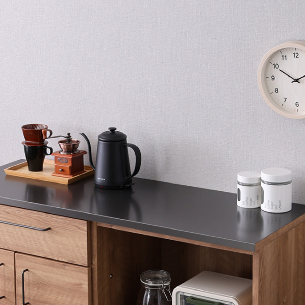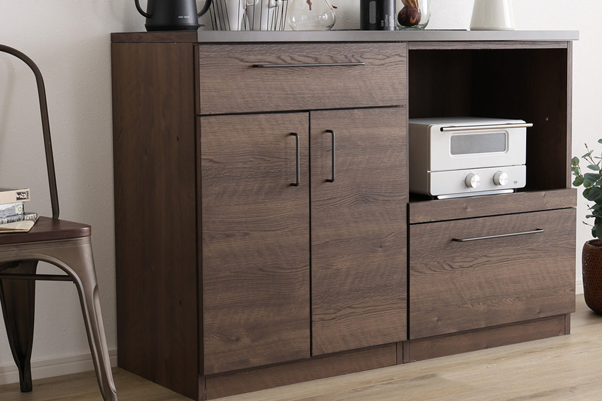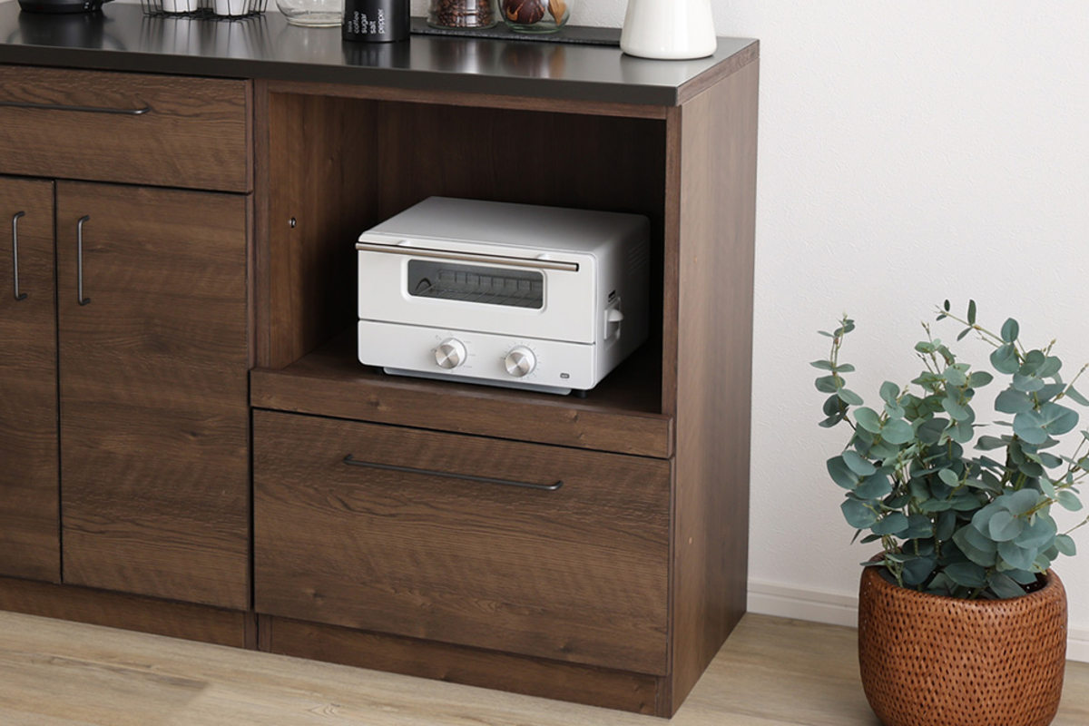 炊飯器や電気ケトルなどのキッチン家電を置くのに便利なスライド棚付きです。手前に引き出せるためフタの開閉や操作がしやすく、蒸気がこもりにくいのもポイントです。使わないときはすっきり収まり、キッチンを広く使えます。