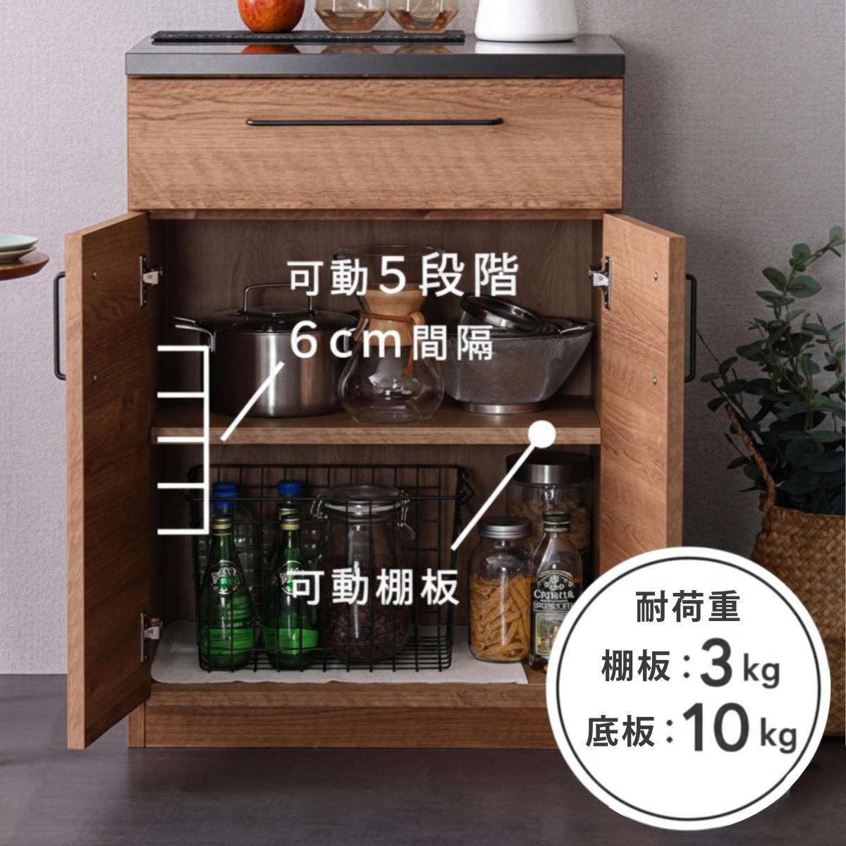 下部には深型の引き出しを備えており、食品のストックやキッチン雑貨の収納に便利です。耐荷重性に配慮したフルスライドレールを採用しているため、収納物が多い場合でもスムーズに奥まで引き出せます。