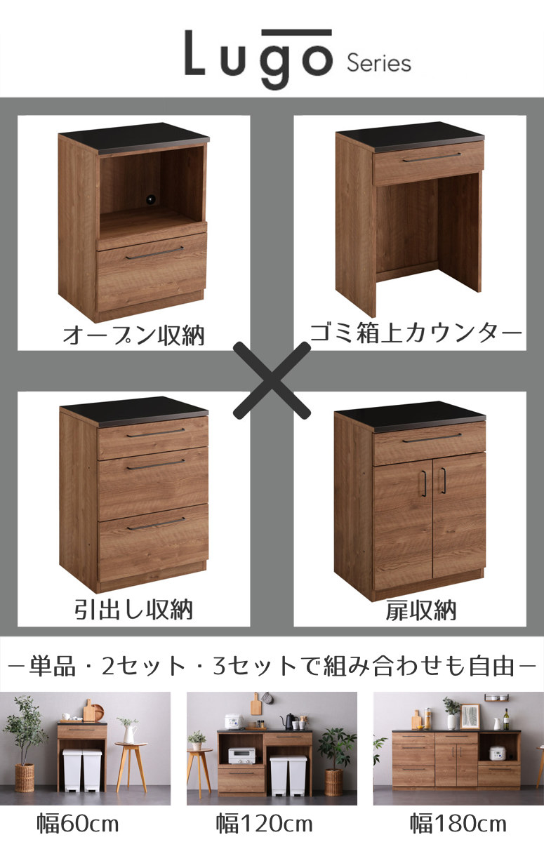 Lugoシリーズには4種類のキッチンカウンターを単品、2個セット、3個セットとして組み合わせた商品もございます。