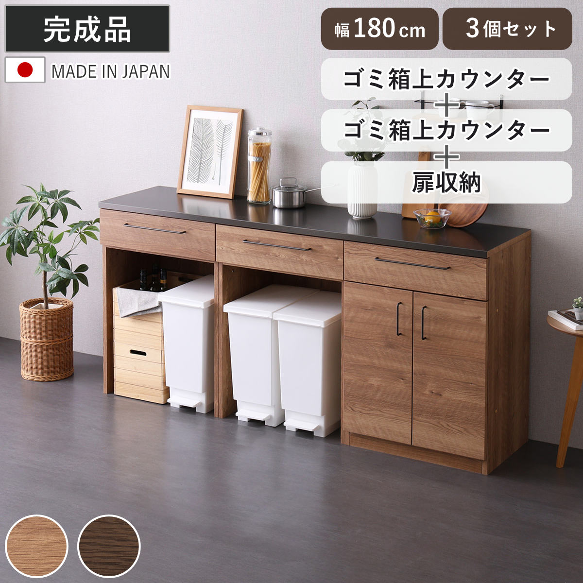![]() ゴミ箱上カウンター2個 扉収納棚 3点セット | ![]() オープン収納棚 ゴミ箱上カウンター 引出し収納棚 3点セット 【▲このページの商品】 | ![]() オープン収納棚 ゴミ箱上カウンター 扉収納棚 3点セット |