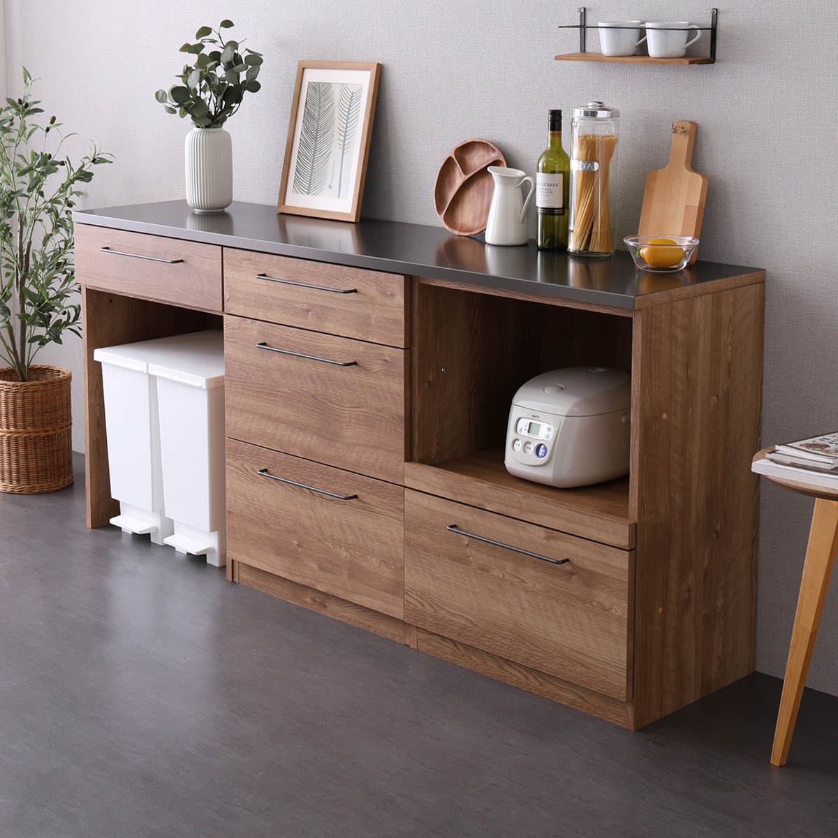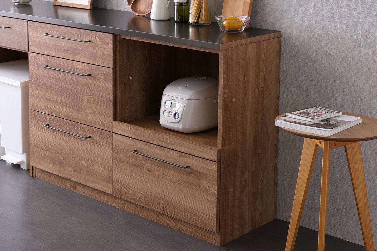 炊飯器や電気ケトルなどのキッチン家電を置くのに便利なスライド棚付きです。手前に引き出せるためフタの開閉や操作がしやすく、蒸気がこもりにくいのもポイントです。使わないときはすっきり収まり、キッチンを広く使えます。