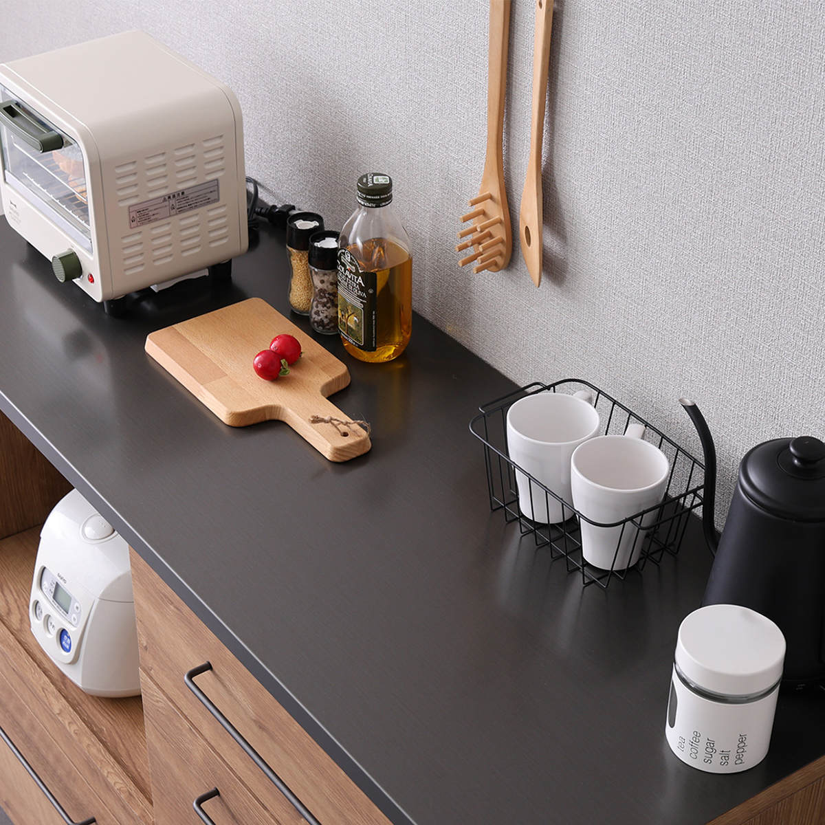 特殊加工を施した鋼板天板を採用しています。継ぎ目のないフラット設計で広々使え、金属ならではのシャープな質感が、キッチン空間をすっきりとスタイリッシュに演出します。耐熱性に配慮し、指紋が付きにくく薬品にも強い、機能面にも優れた仕様です。
