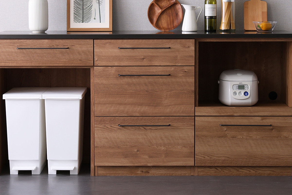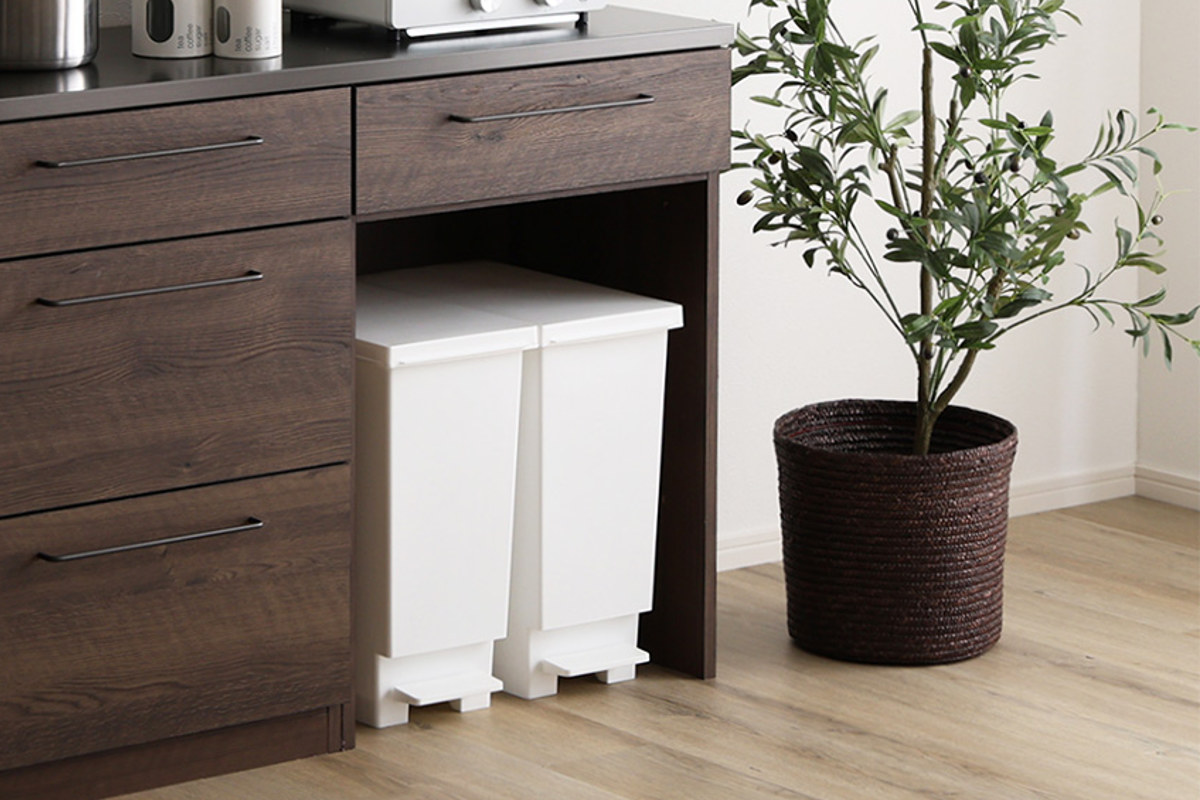 カウンター下にゴミ箱を収納できるため、キッチンをすっきりと見せることができます。デッドスペースになりがちなゴミ箱上を、収納や作業スペースとして有効活用できるので便利です。