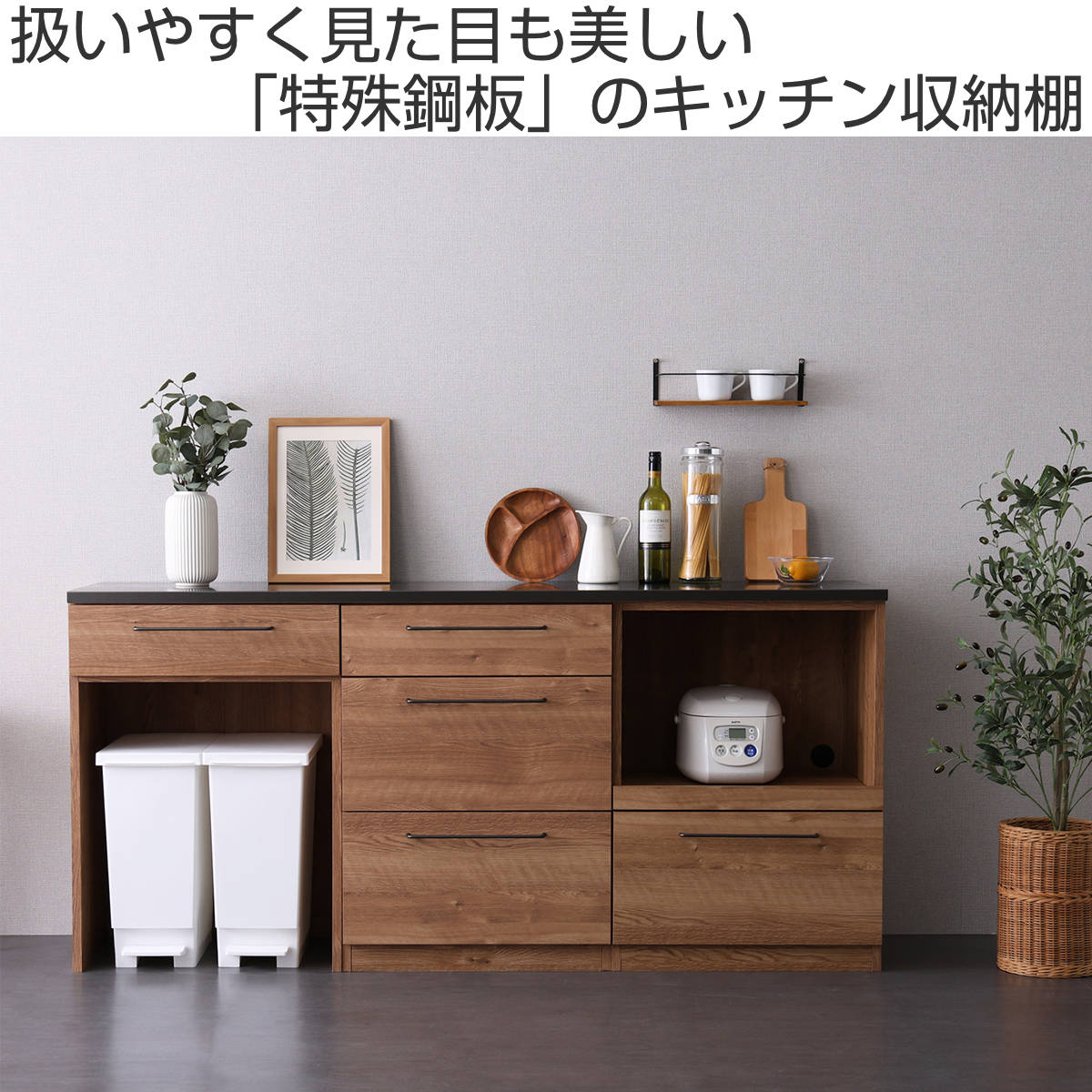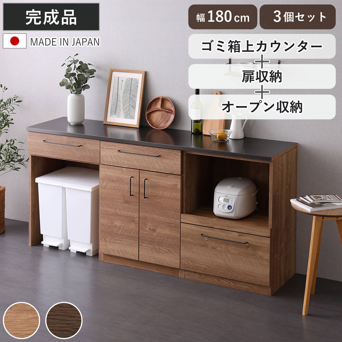 キッチンカウンター 幅180cm 3点セット レンジ台 チェスト ゴミ箱上ラック 日本製 完成品 スライド棚 特殊鋼板 キッチン収納 ( カウンター キッチン ルゴ 3台セット フルスライドレール ) 【ナチュラル】