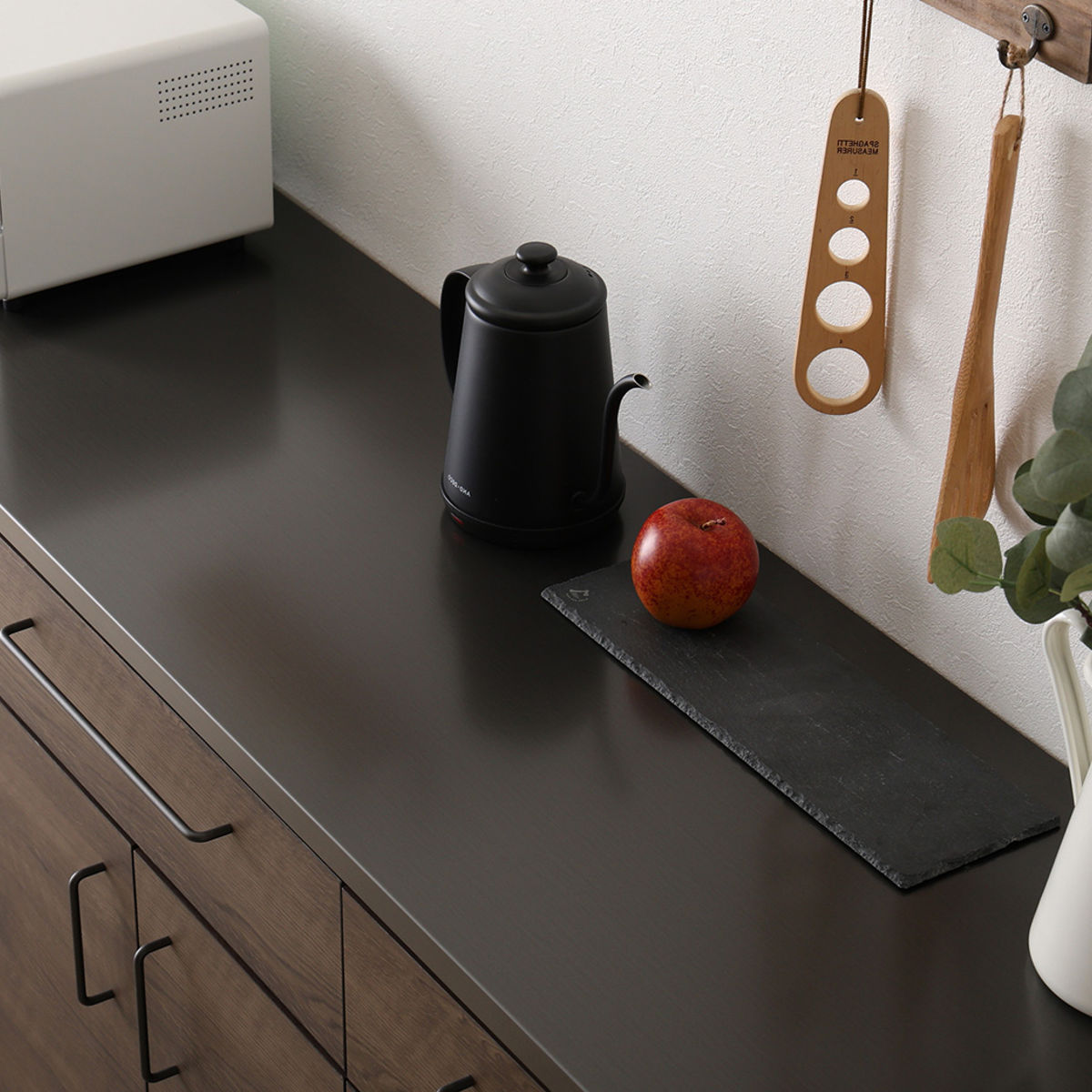 特殊加工を施した鋼板天板を採用しています。継ぎ目のないフラット設計で広々使え、金属ならではのシャープな質感が、キッチン空間をすっきりとスタイリッシュに演出します。耐熱性に配慮し、指紋が付きにくく薬品にも強い、機能面にも優れた仕様です。