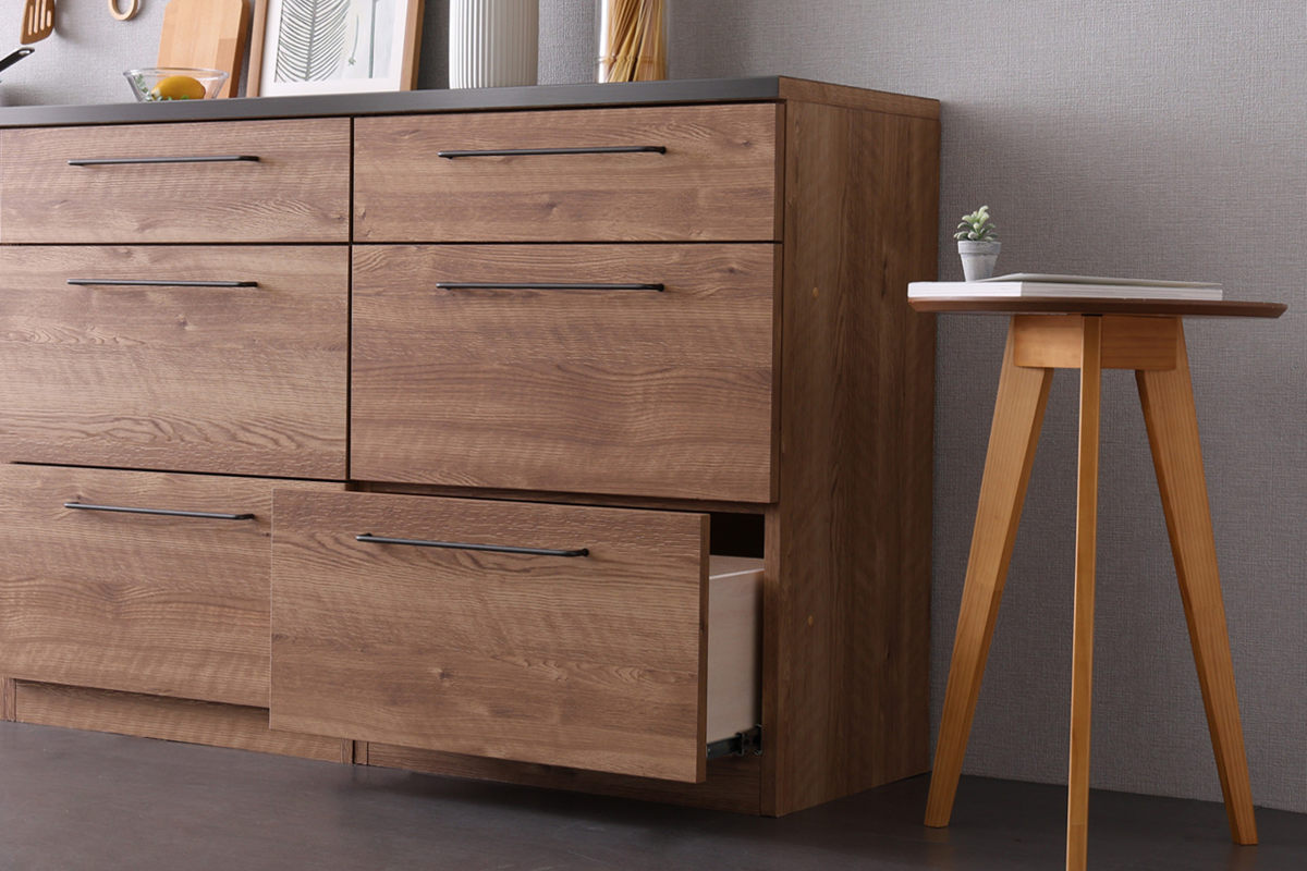 引出し収納棚は浅型が1杯、深型が2杯の計3杯の引き出し収納を備え、カトラリーや調理小物、食品ストックまでまとめて収納するのに便利です。