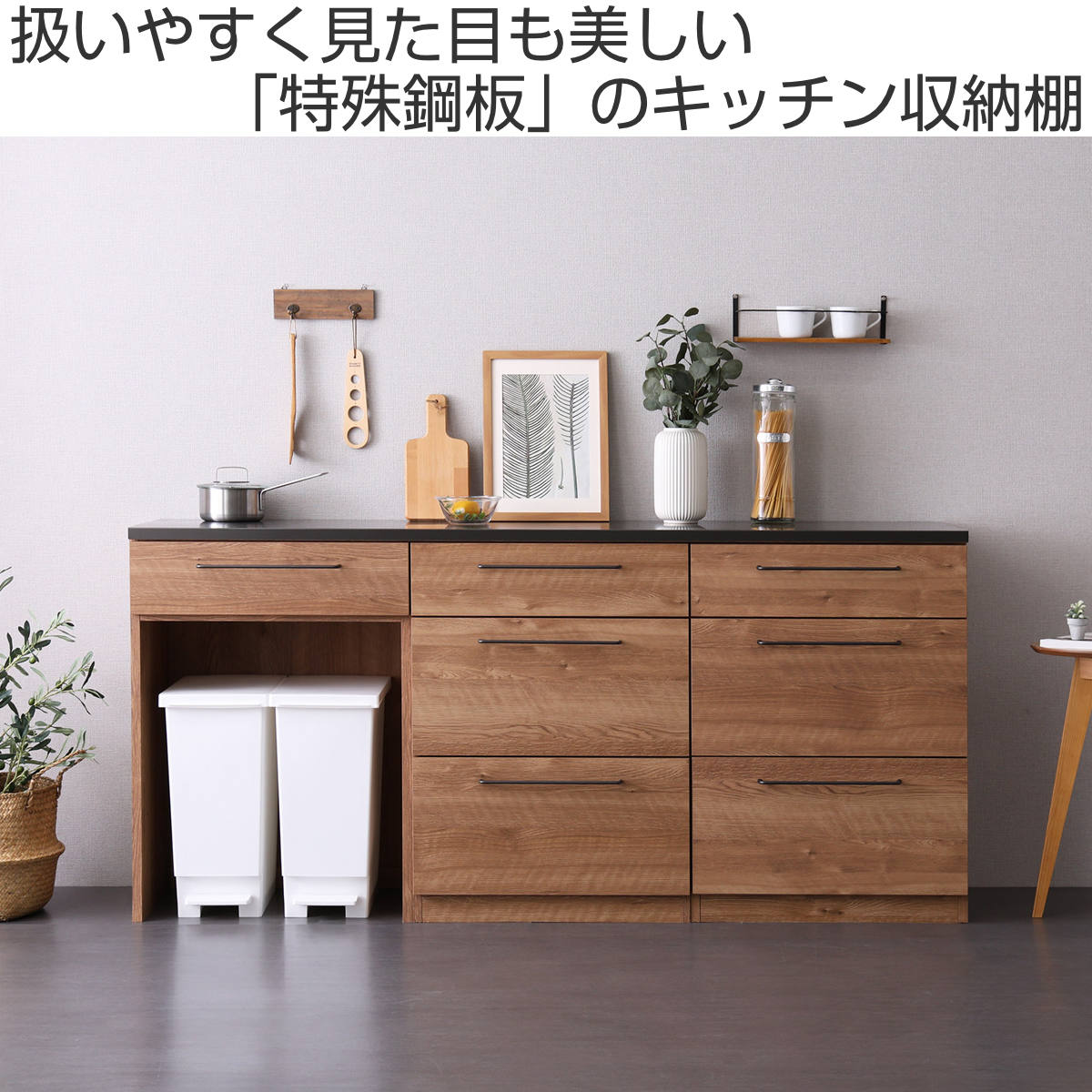 キッチンカウンター 幅180cm 3点セット ゴミ箱ラック チェスト 日本製 完成品 特殊鋼板 キッチン収納 ( キッチン 収納 組み合わせ ダストボックス収納 ルゴ 3台セット フルスライドレール ナチュラル ウォールナット ) 【ナチュラル】