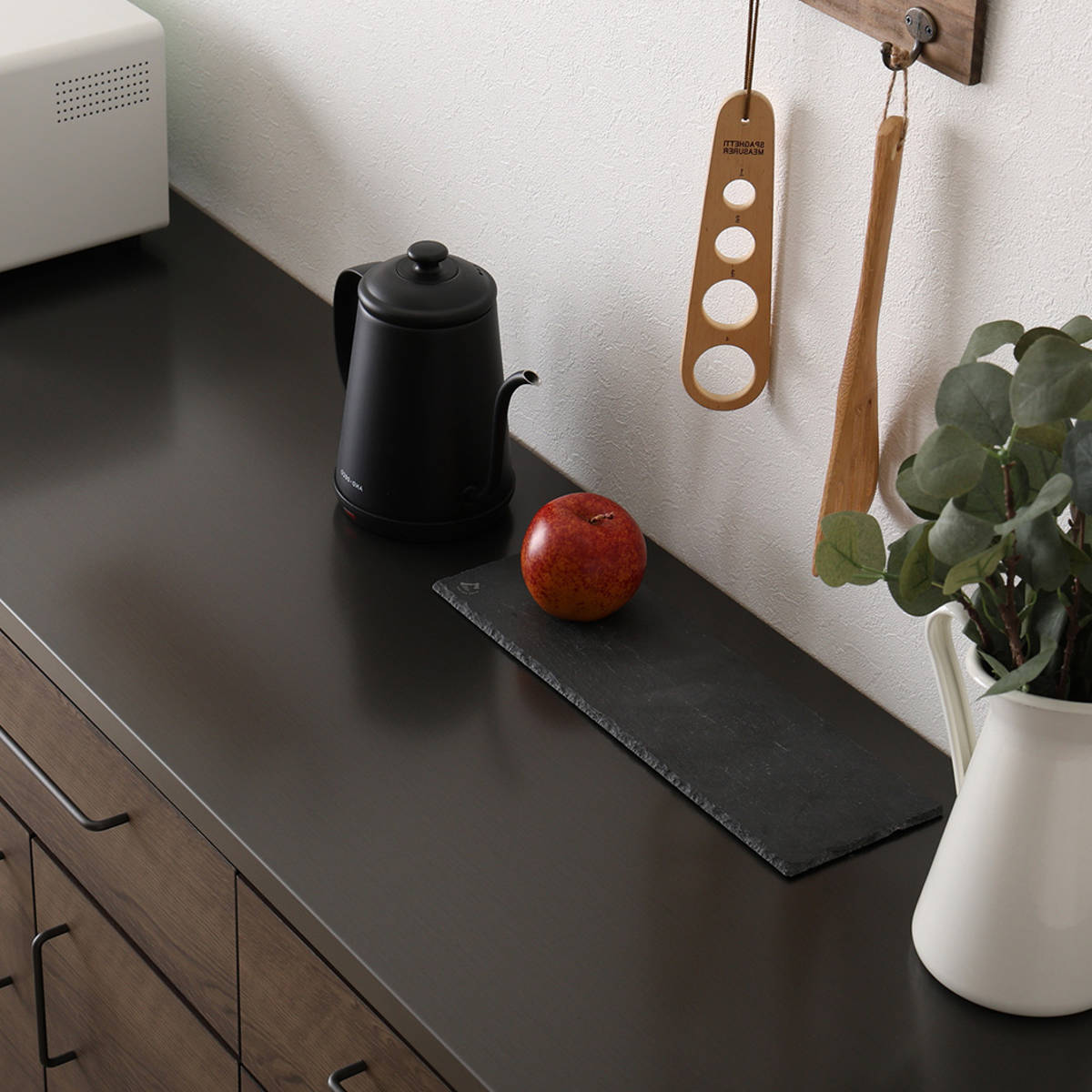 特殊加工を施した鋼板天板を採用しています。継ぎ目のないフラット設計で広々使え、金属ならではのシャープな質感が、キッチン空間をすっきりとスタイリッシュに演出します。耐熱性に配慮し、指紋が付きにくく薬品にも強い、機能面にも優れた仕様です。