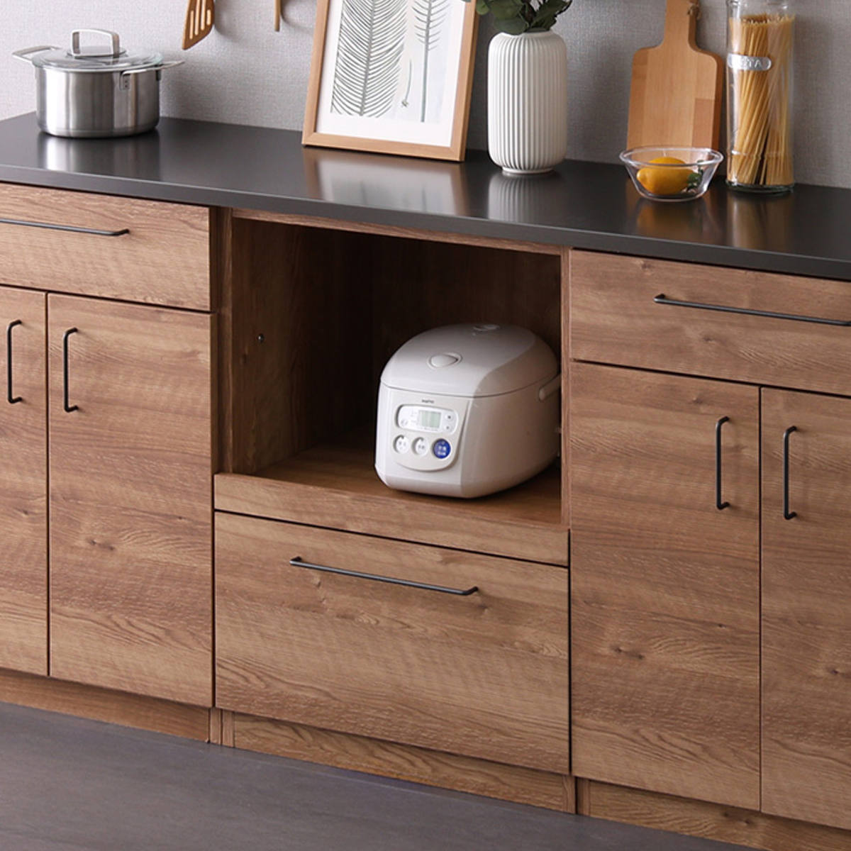 炊飯器や電気ケトルなどのキッチン家電を置くのに便利なスライド棚付きです。手前に引き出せるためフタの開閉や操作がしやすく、蒸気がこもりにくいのもポイントです。使わないときはすっきり収まり、キッチンを広く使えます。