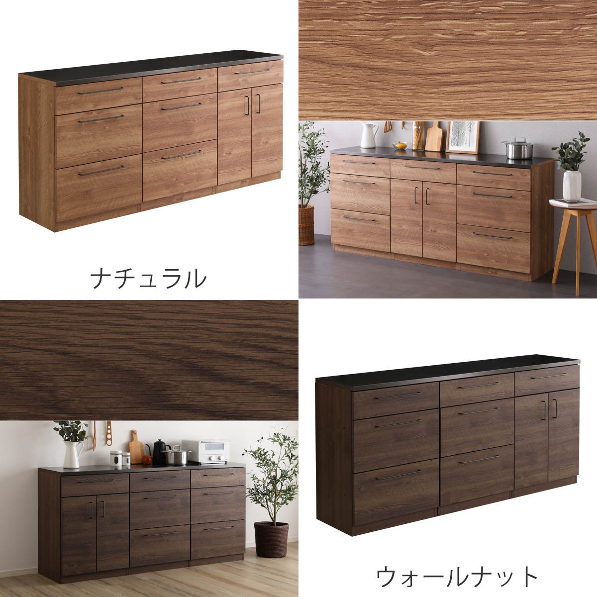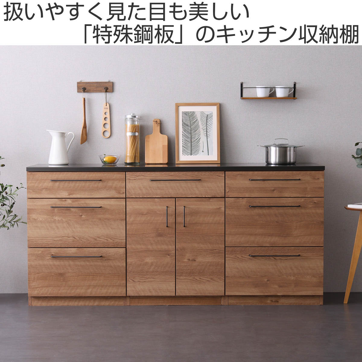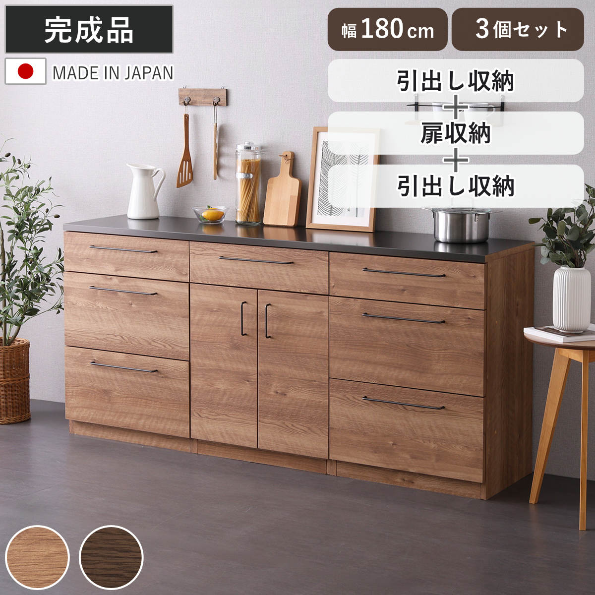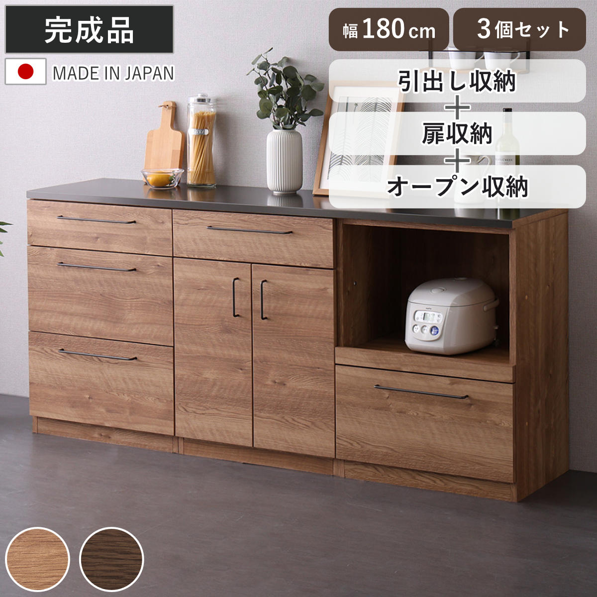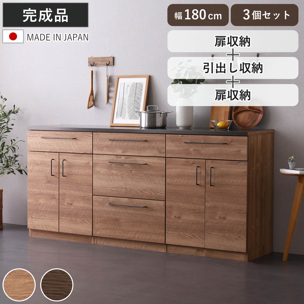 キッチンカウンター 幅180cm 3点セット チェスト 開き扉 日本製 完成品 特殊鋼板 キッチン収納 ( カウンター キッチン 収納 組み合わせ ルゴ 3台セット フルスライドレール ナチュラル ウォールナット ) 【ナチュラル】