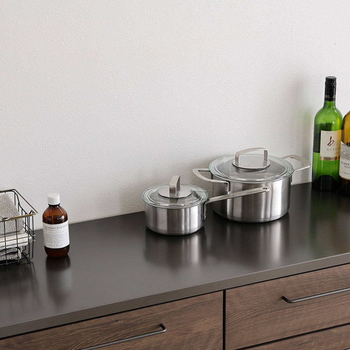 特殊加工を施した鋼板天板を採用しています。継ぎ目のないフラット設計で広々使え、金属ならではのシャープな質感が、キッチン空間をすっきりとスタイリッシュに演出します。耐熱性に配慮し、指紋が付きにくく薬品にも強い、機能面にも優れた仕様です。