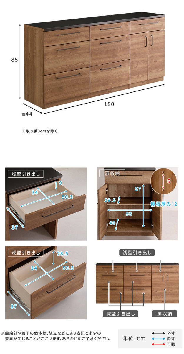 | 内容量 | 1台 (引出し収納×2、扉収納棚×1、天板×1) |