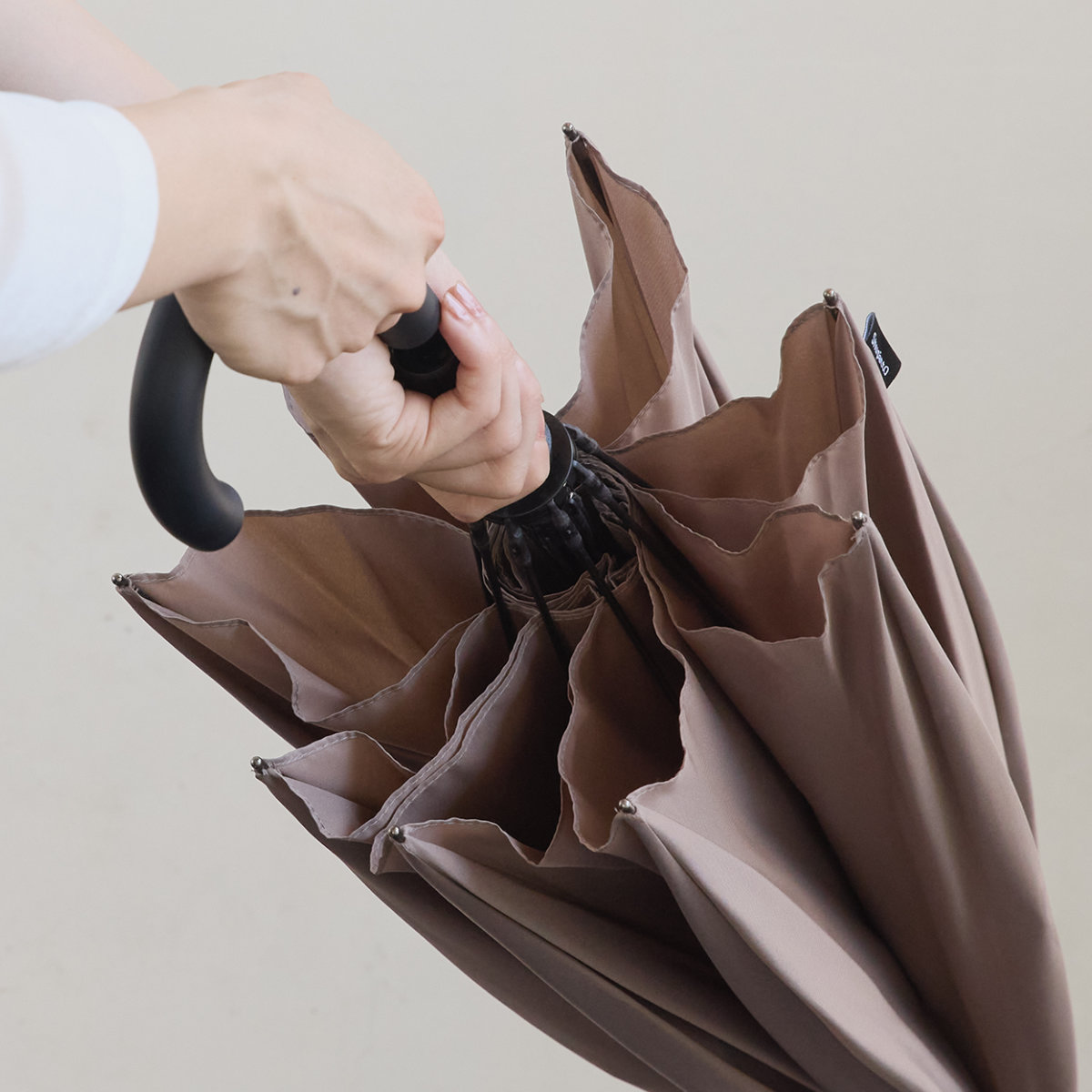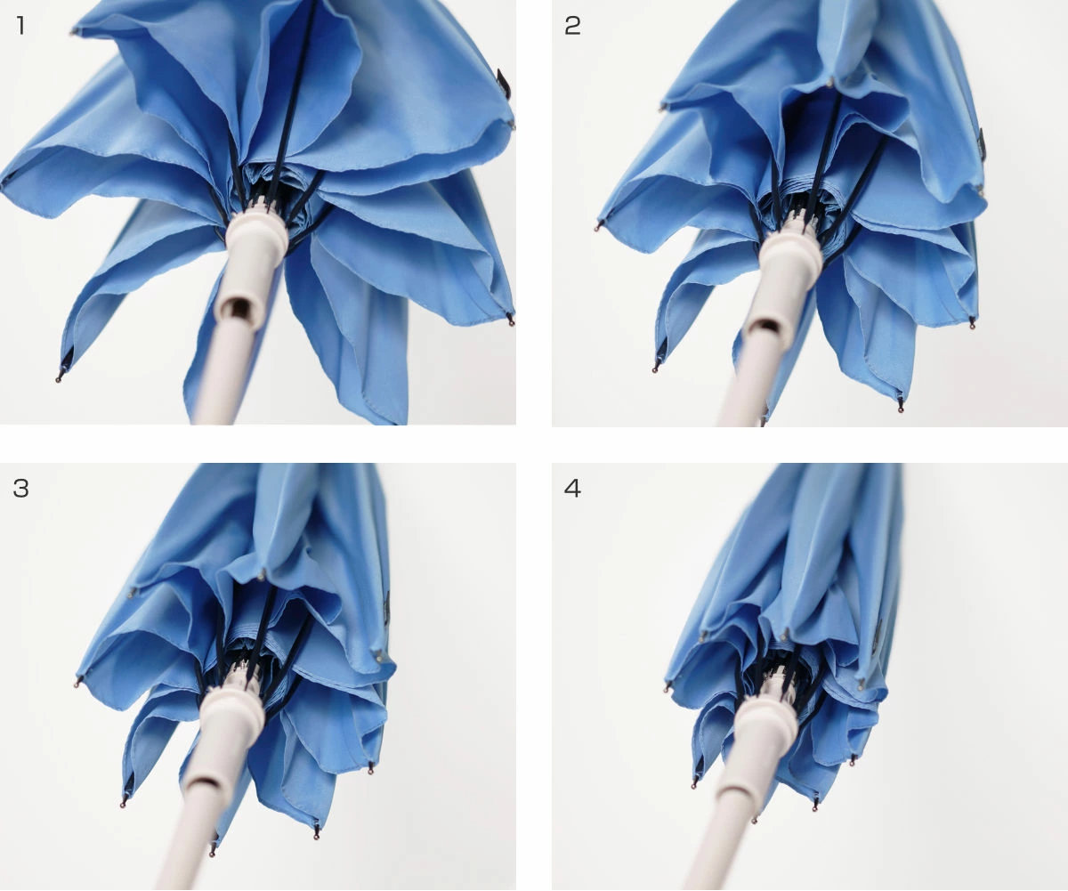閉じる動作に連動して骨が回転し、軸を中心に生地がくるくると自動で巻き込まれます。最後に手で生地を整えたりベルトで留めたりする手間がなく、手を濡らさずスムーズに傘をたためます。