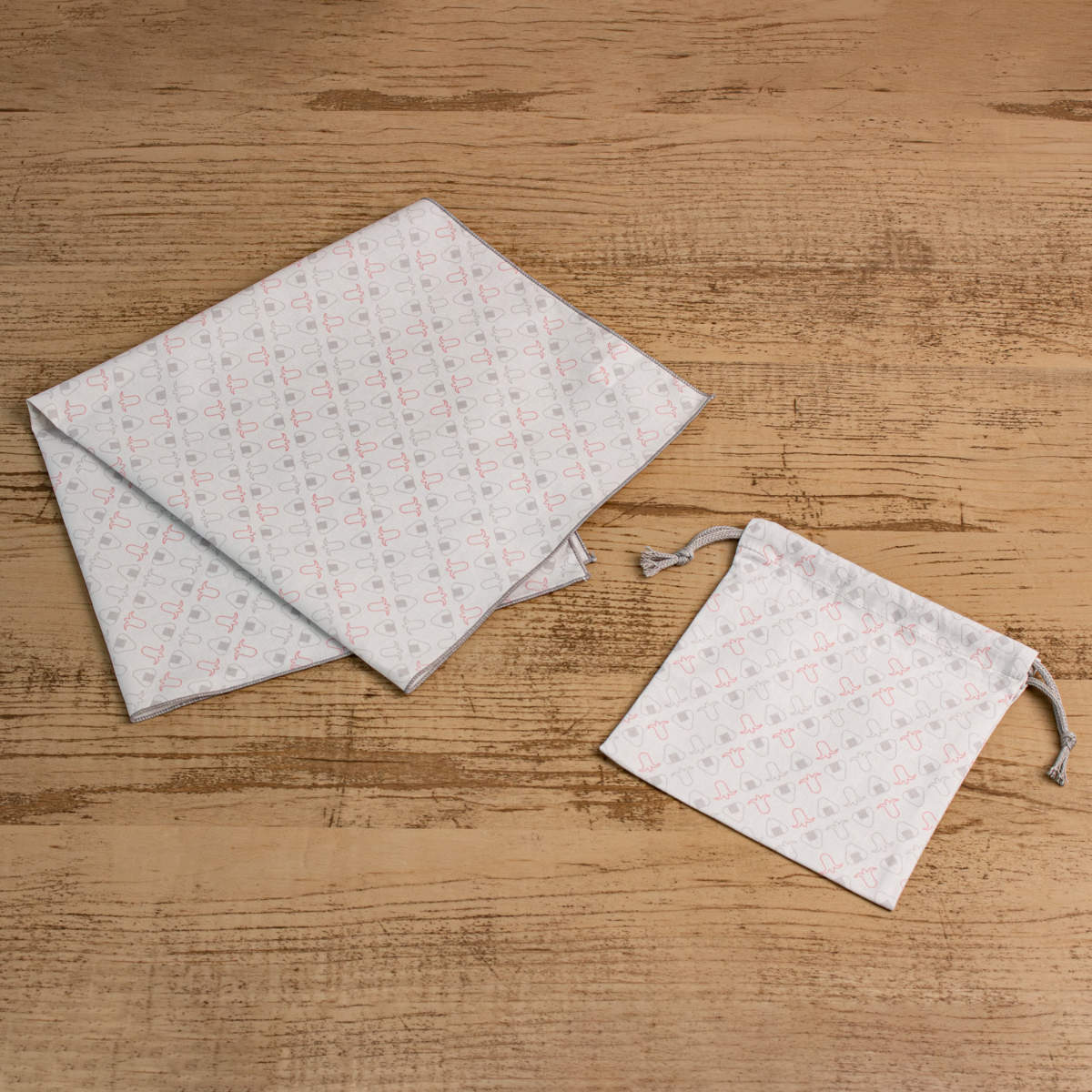 同じデザインの巾着袋も展開しています。単品での使用はもちろん、シリーズで揃えて持ち歩けば、ランチタイムのトータルコーディネートが完成します。自分用にはもちろん、セットでのギフトにもおすすめです。