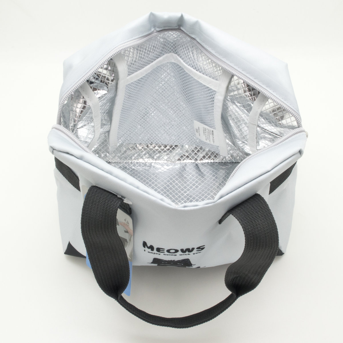 バッグの内側にアルミ素材を使用しており、保冷効果があります。また、保冷剤を入れられるメッシュポケット付きなので、さらに保冷力をアップすることもできます。暑い時期のお弁当の持ち歩きや飲み物の冷たさをキープしたいときに便利です。