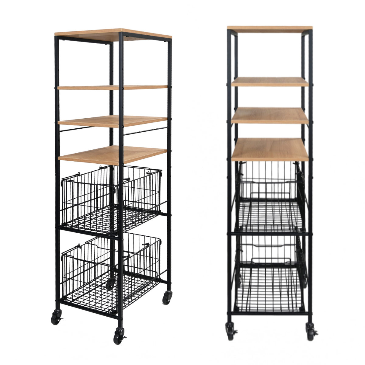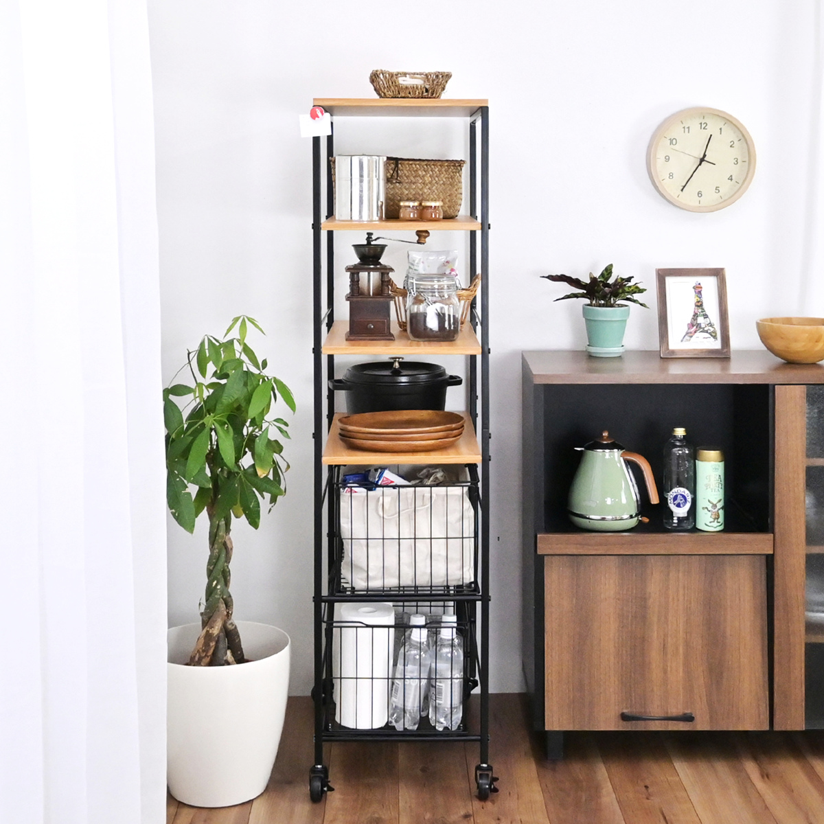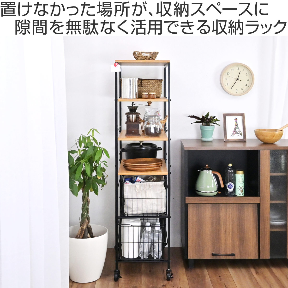 狭い場所も無駄にしないスリム収納 で、冷蔵庫横やキッチンの隙間にもすっきり収まります。限られたスペースを有効活用できる、省スペース設計の収納ラックです。