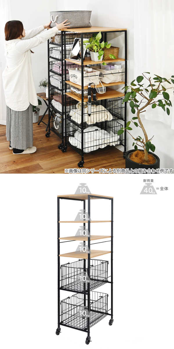 全体耐荷重は40kg。天板・棚板・バスケットそれぞれ10kgまで収納可能です。重い調味料や食材も安心して置けて、まとめ買いや日常使いの収納でも安定感抜群です。さらに天板の上にも物を置けるので、スペースを無駄なく活用できます。