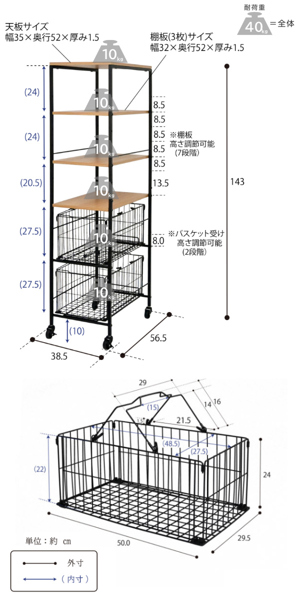 | 耐荷重 | 全体耐荷重:40kg バスケット(大):10kg |
