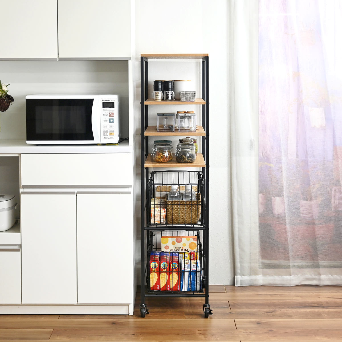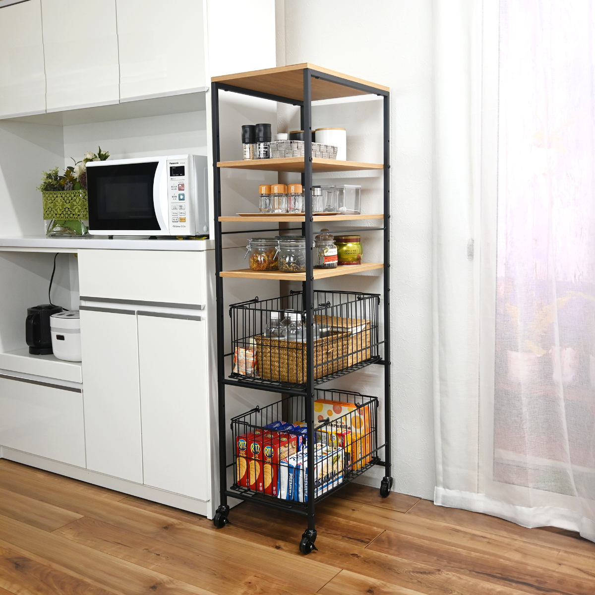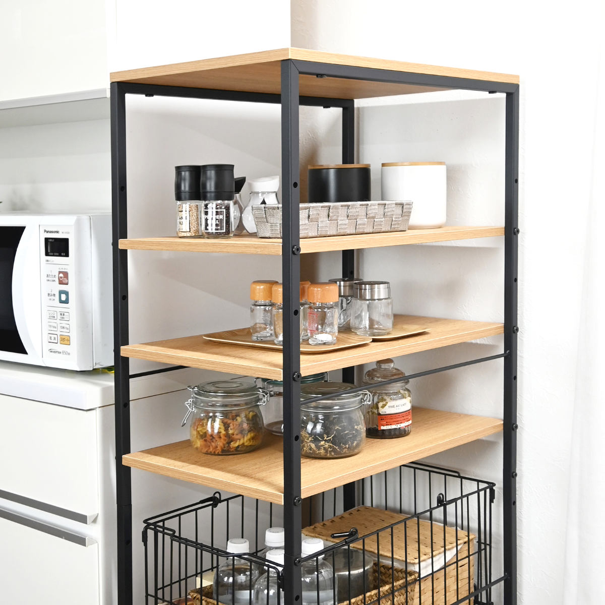 棚とバスケットを組み合わせた、使い分けしやすい収納です。棚には調味料や保存容器を並べて、見せる収納ができます。バスケットには食品のストックやレトルト類をまとめて収納できます。用途に合わせて整理できる、使い勝手の良い設計です。