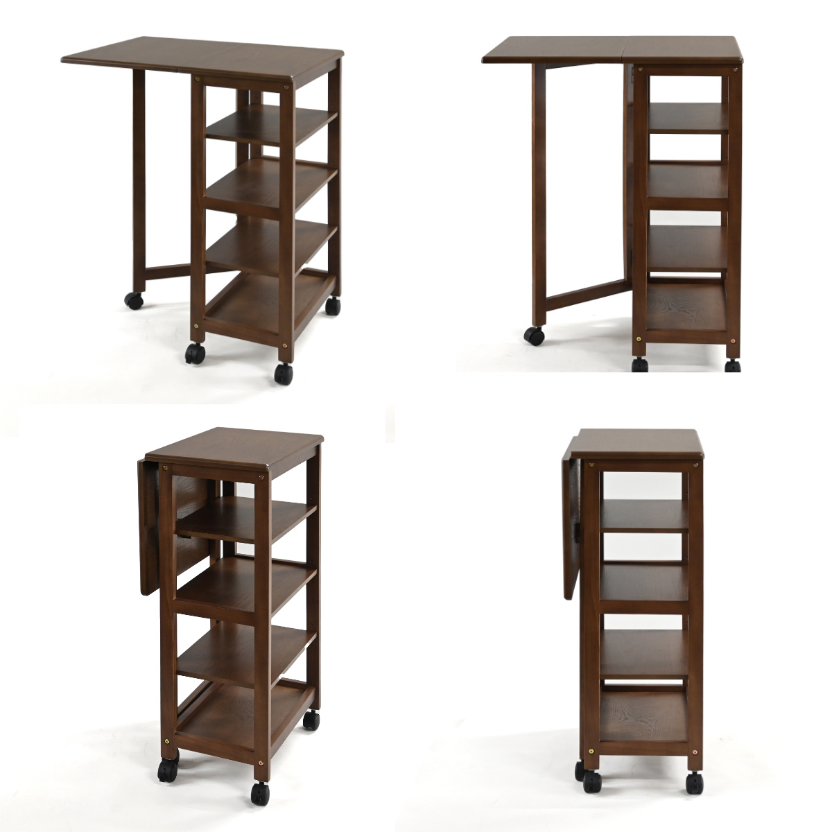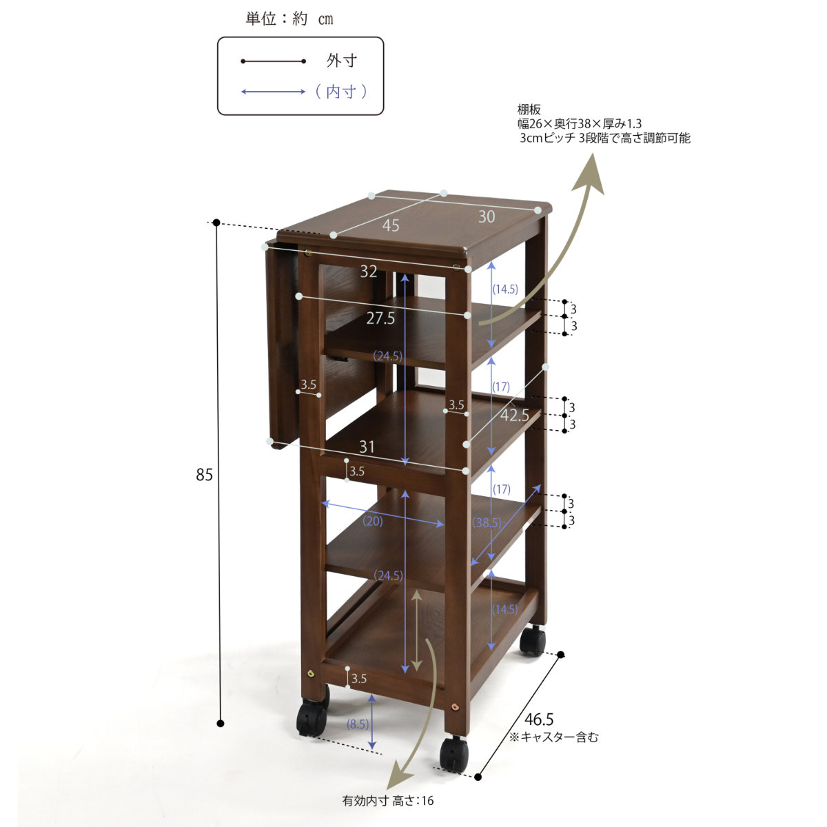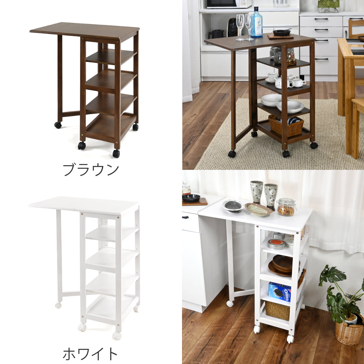 キッチンワゴン 幅65cm 片バタワゴン 作業台 折りたたみ キャスター付き 天然木 ( ワゴン 木製 キッチン収納 トロリー 片バタ バタフライ天板 天板が畳める 4段 可動棚 省スペース ブラウン ホワイト ) 【ブラウン】