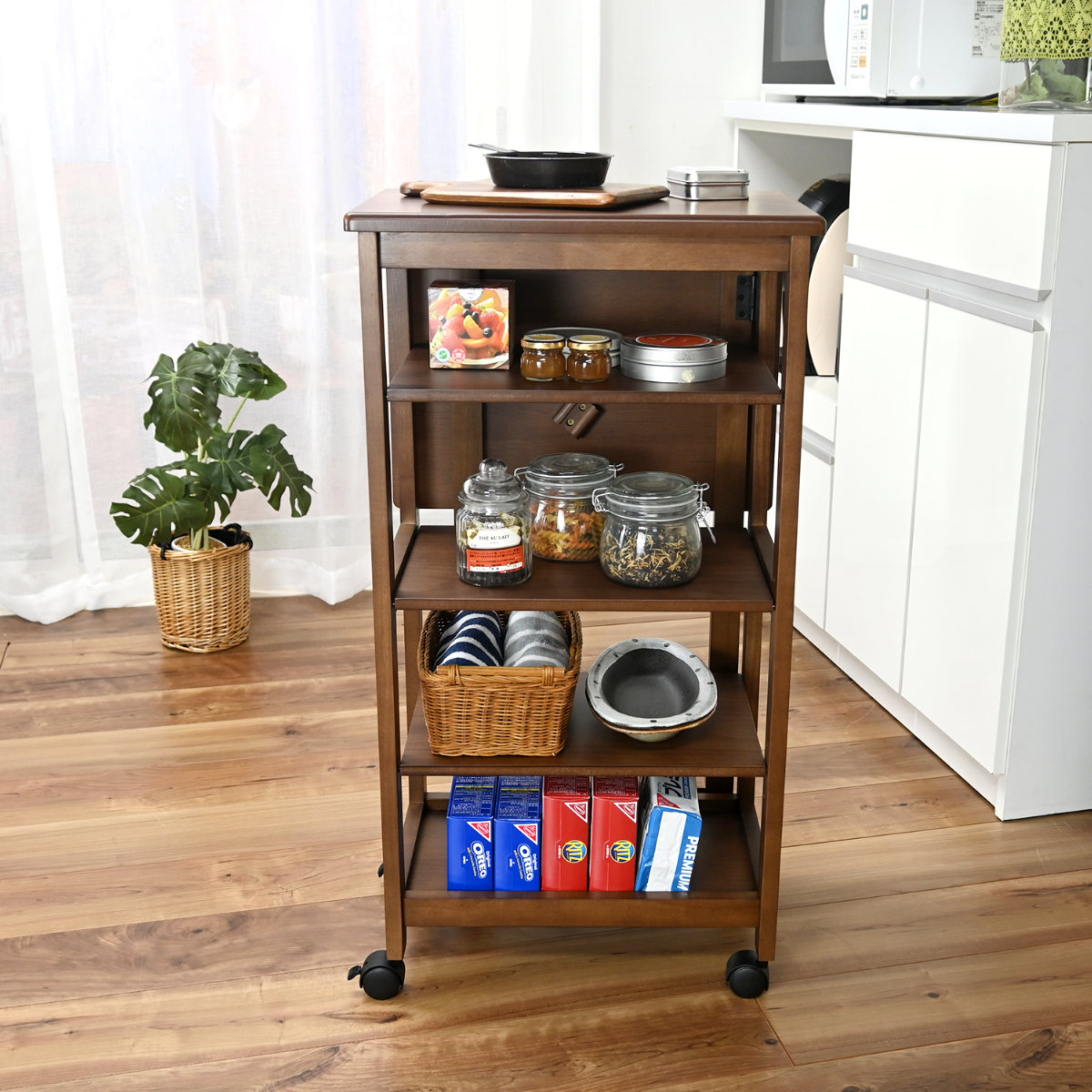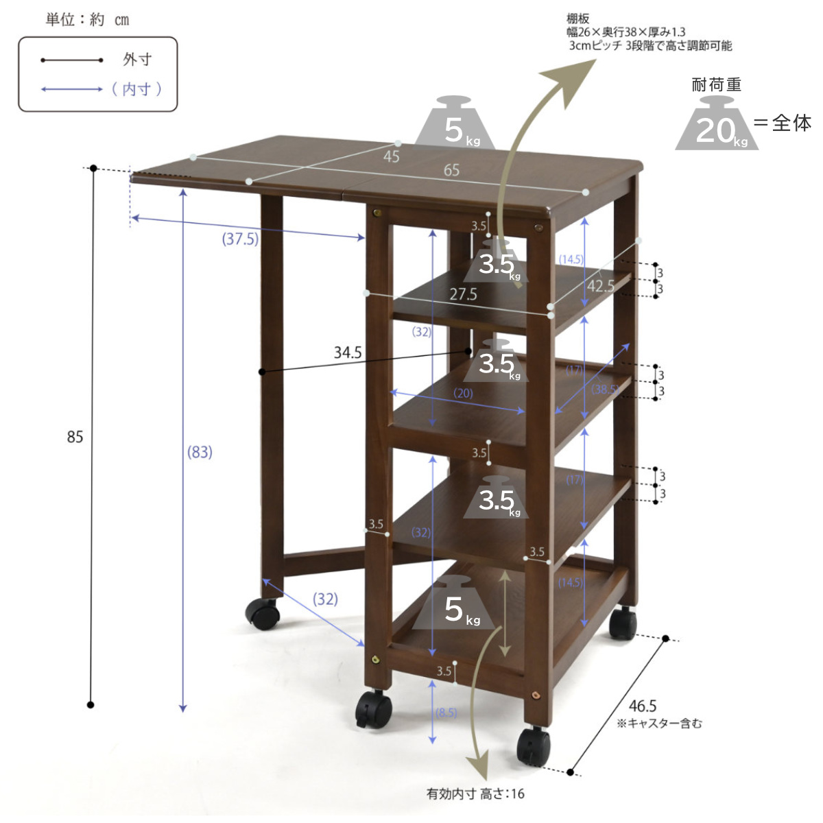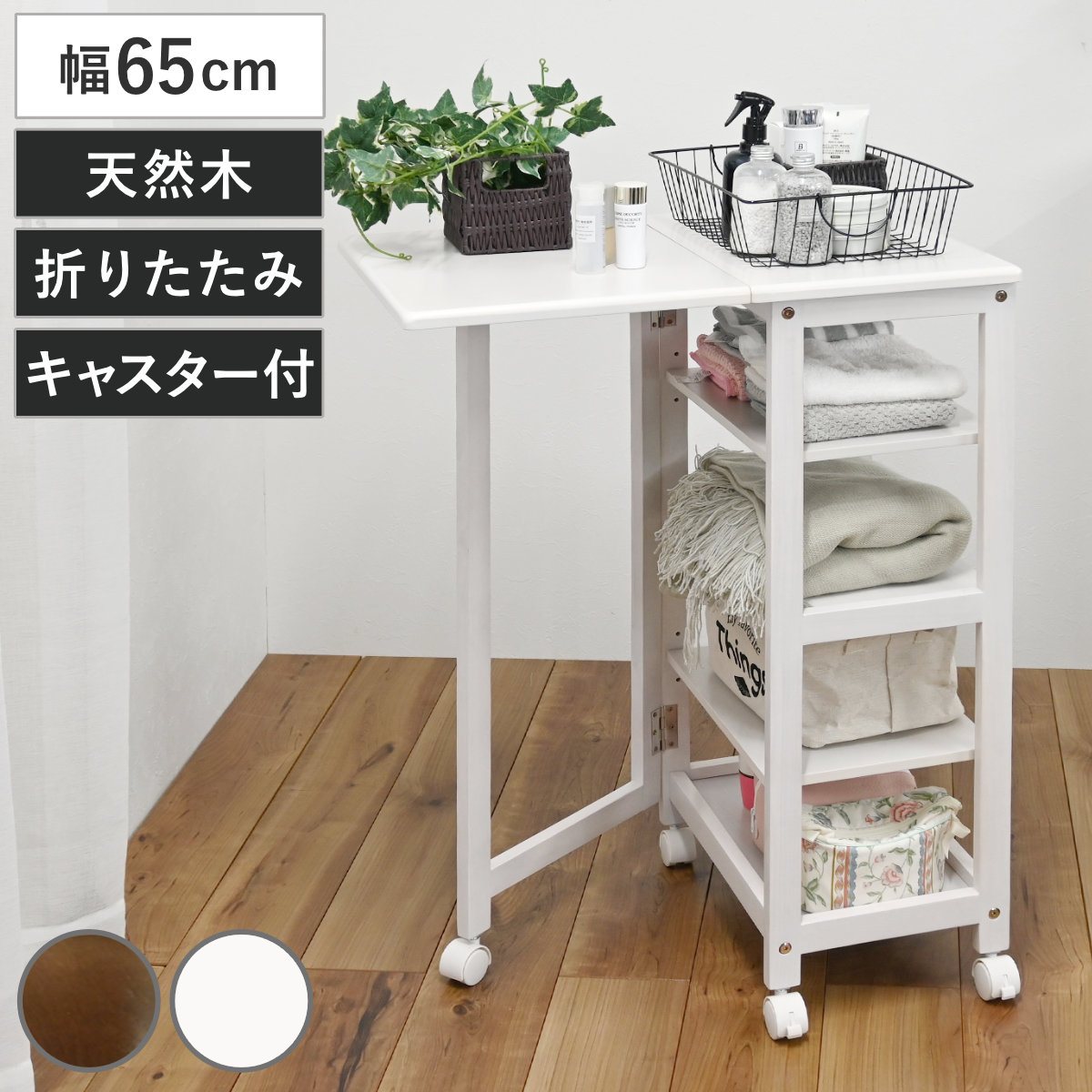 キッチンワゴン 幅65cm 片バタワゴン 作業台 折りたたみ キャスター付き 天然木 ( ワゴン 木製 キッチン収納 トロリー 片バタ バタフライ天板 天板が畳める 4段 可動棚 省スペース ブラウン ホワイト ) 【ブラウン】