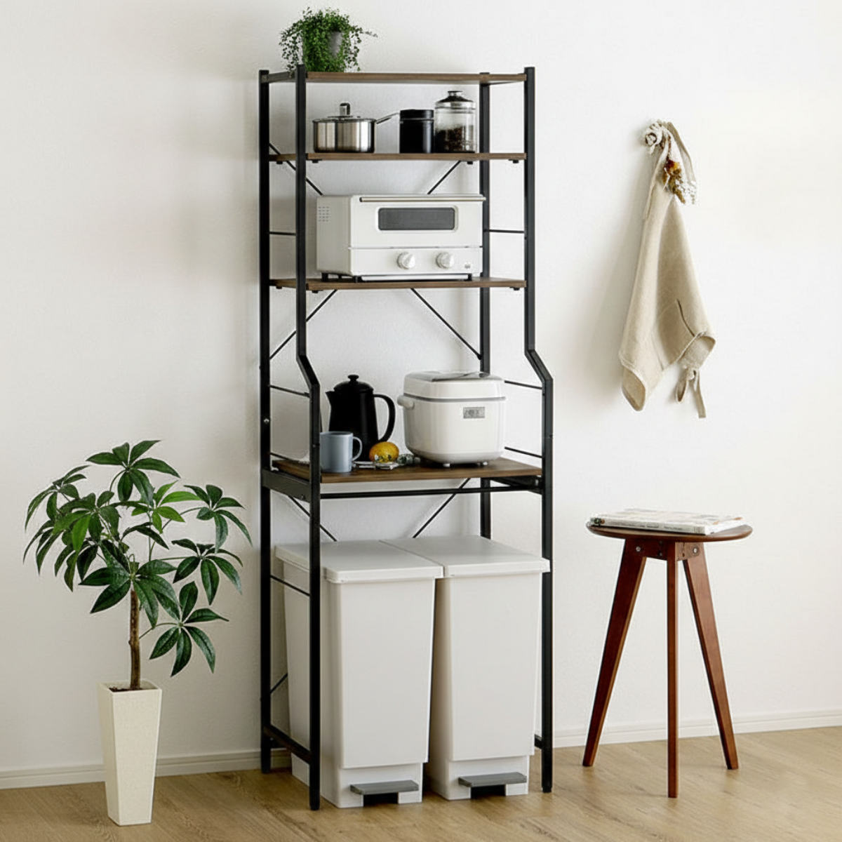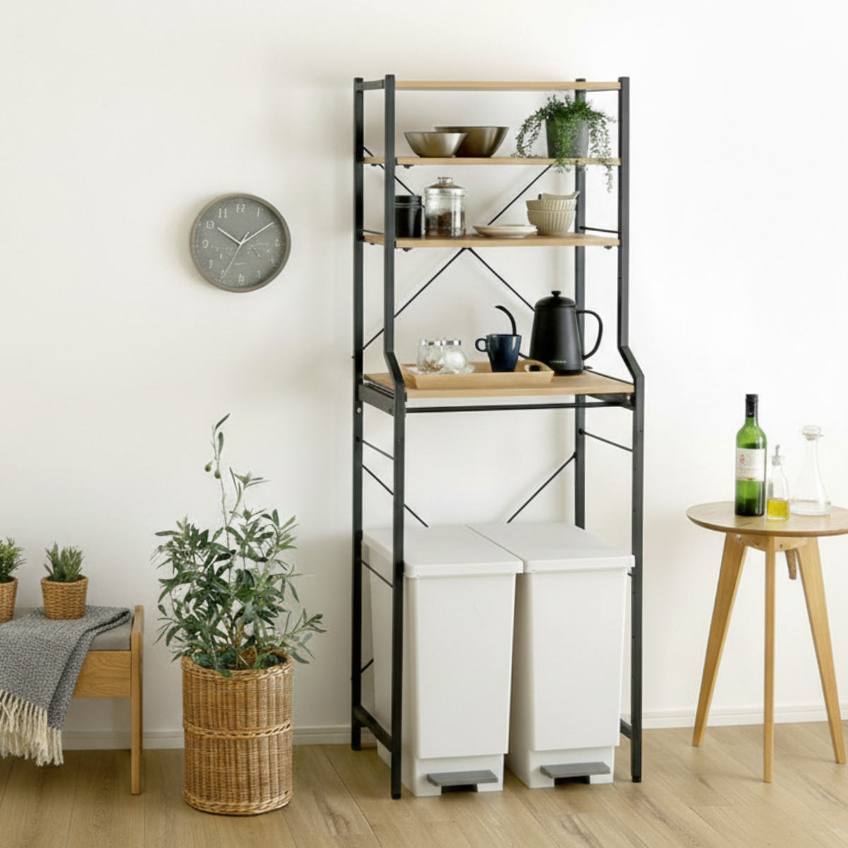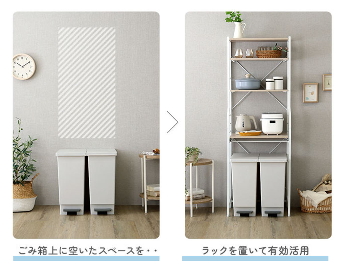 ゴミ箱上ラックとしてだけでなく、日用品の収納やワゴン置き場など多目的にお使いいただけます。限られたスペースでも、スッキリとした印象を保つことができます。
