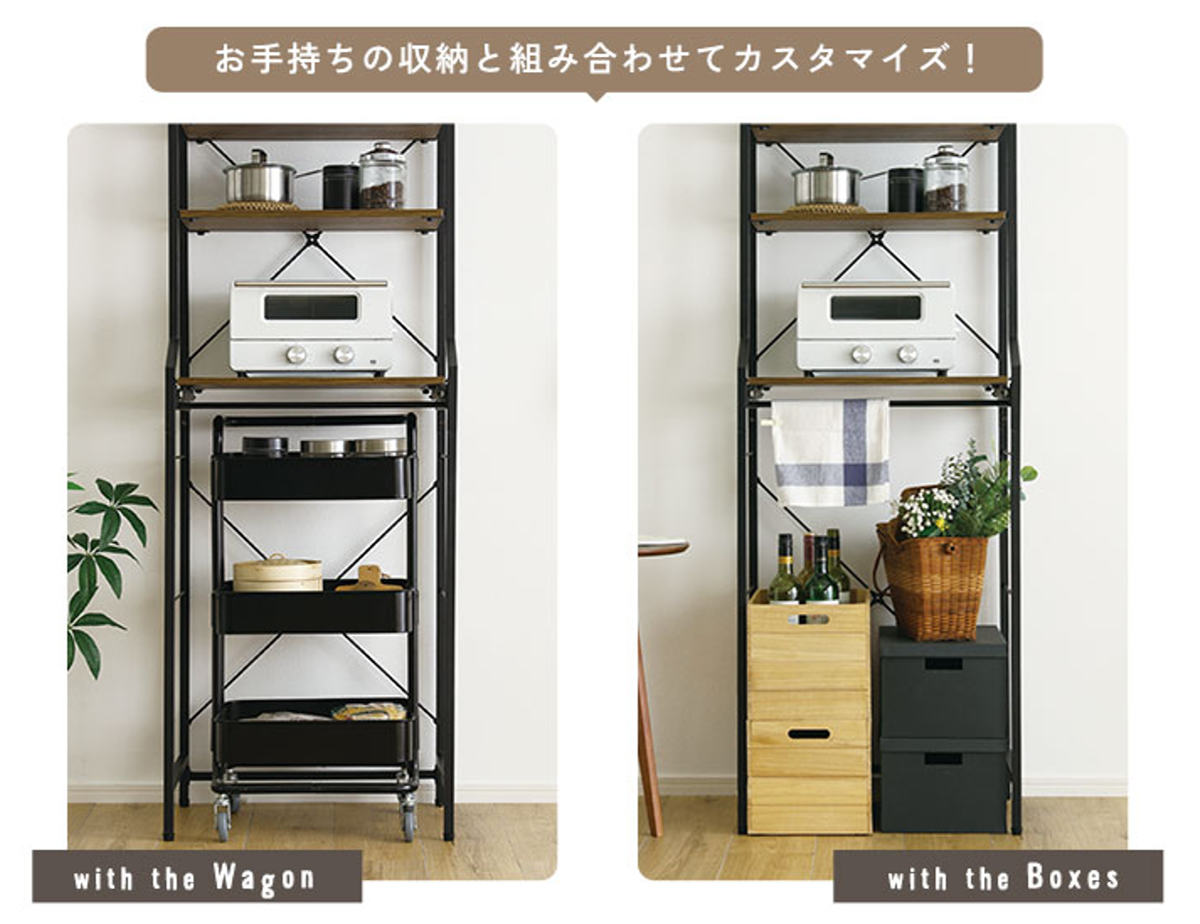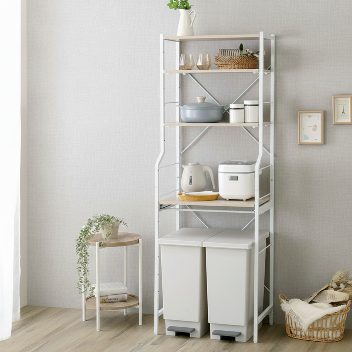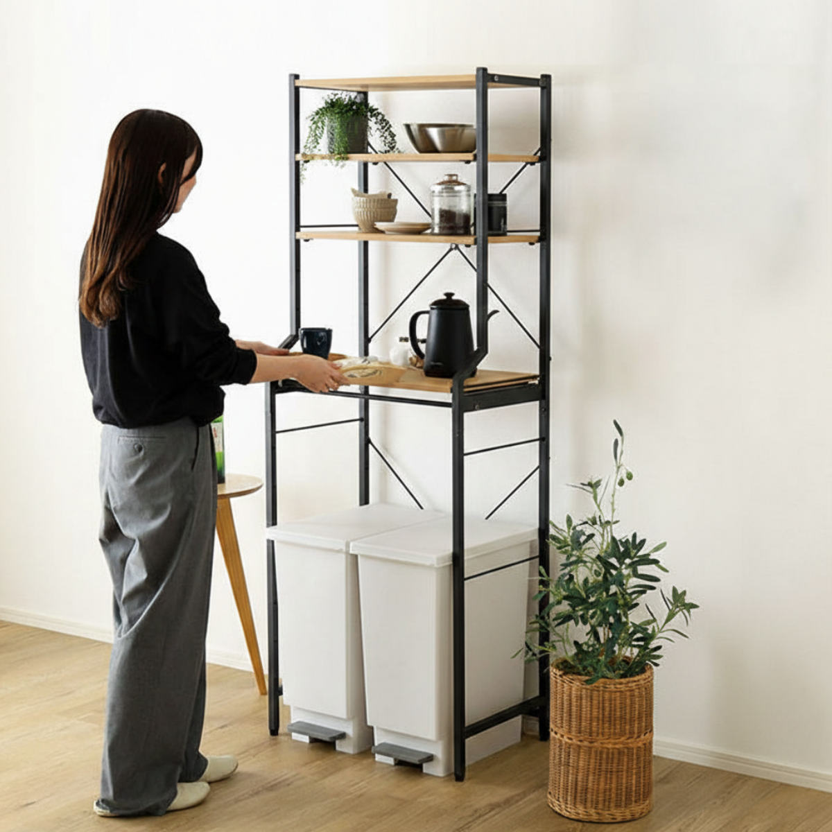 ゴミ箱上ラックとしてだけでなく、日用品の収納やワゴン置き場など多目的にお使いいただけます。限られたスペースでも、スッキリとした印象を保つことができます。