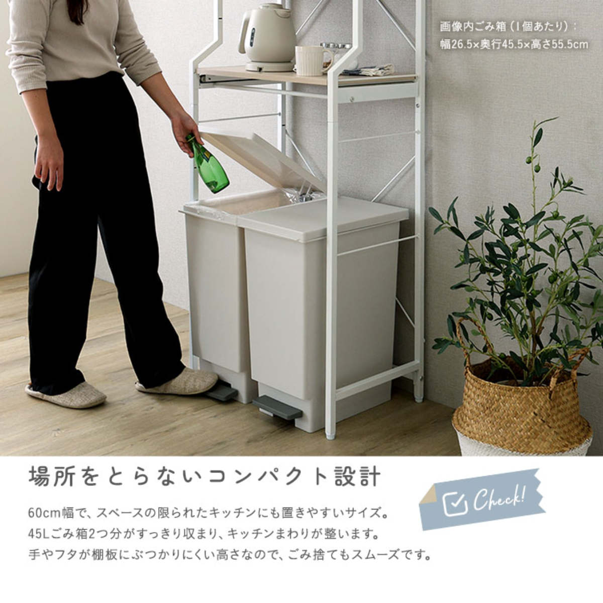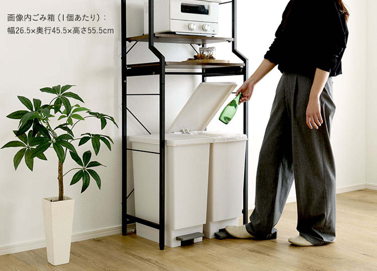 本体幅60cmとキッチンに置きやすいサイズですが、45Lのゴミ箱2個が収まります。手やフタが棚板にぶつかりにくい高さ設計で、ゴミ捨てがスムーズです。