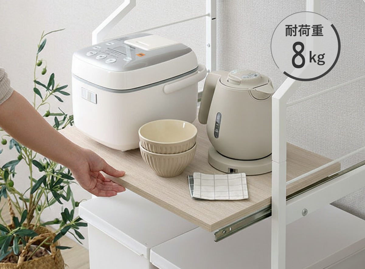 炊飯器やケトルなど蒸気の出る家電の設置にぴったりのスライド棚。さっと引き出して使いやすく、蒸気を逃すので湿気がこもるのを防止します。