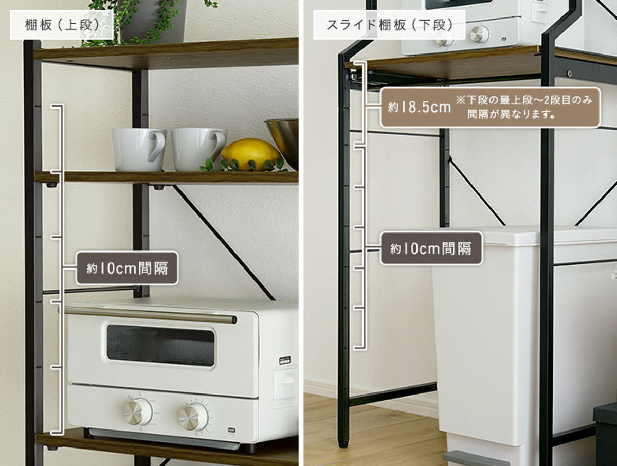 各棚板は、スライド棚の一部を除いて10cm間隔で高さ調節が可能です。棚板をフレームにしっかりと取り付ける仕様で、安定した使い心地です。天板は、安全にお使いいただくため固定棚仕様です。