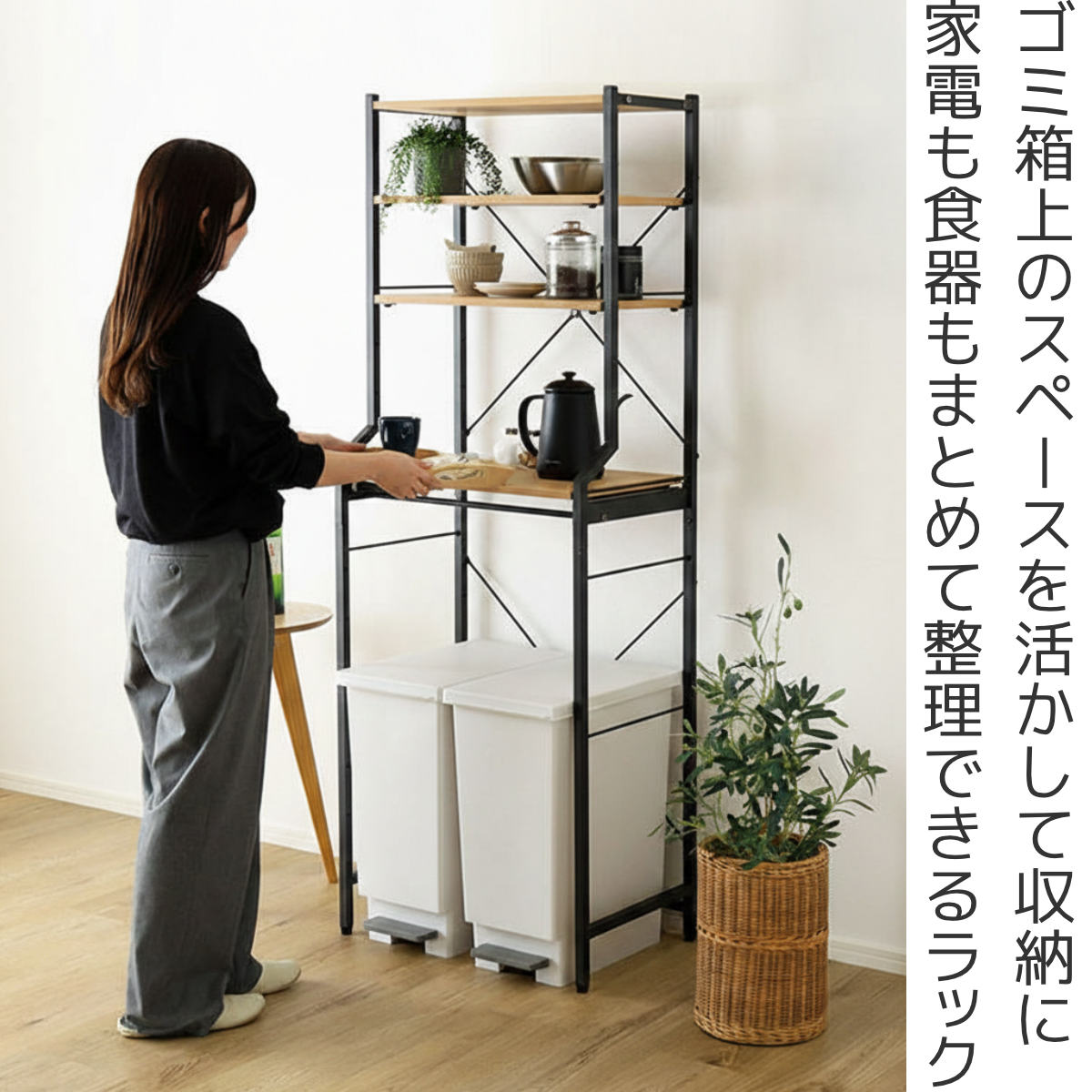 キッチンにできてしまうゴミ箱上のスペースを収納として活かせるゴミ箱上ラックです。家電や食器、キッチン小物をまとめて整理できる省スペース設計。圧迫感のないフレームデザインで、ゆとりのあるキッチン空間が出来上がります。