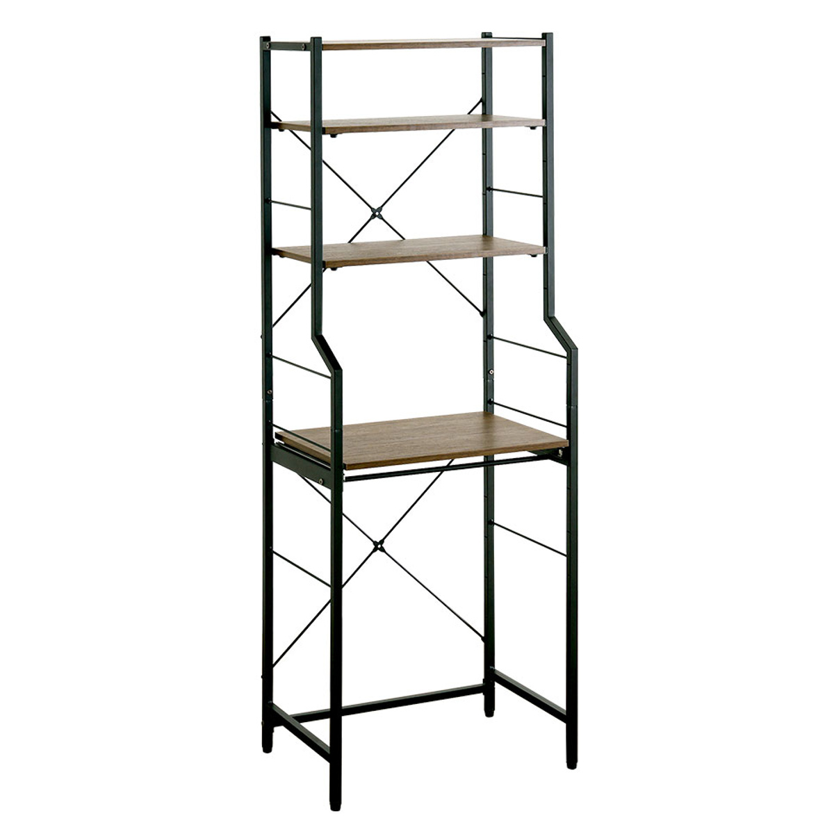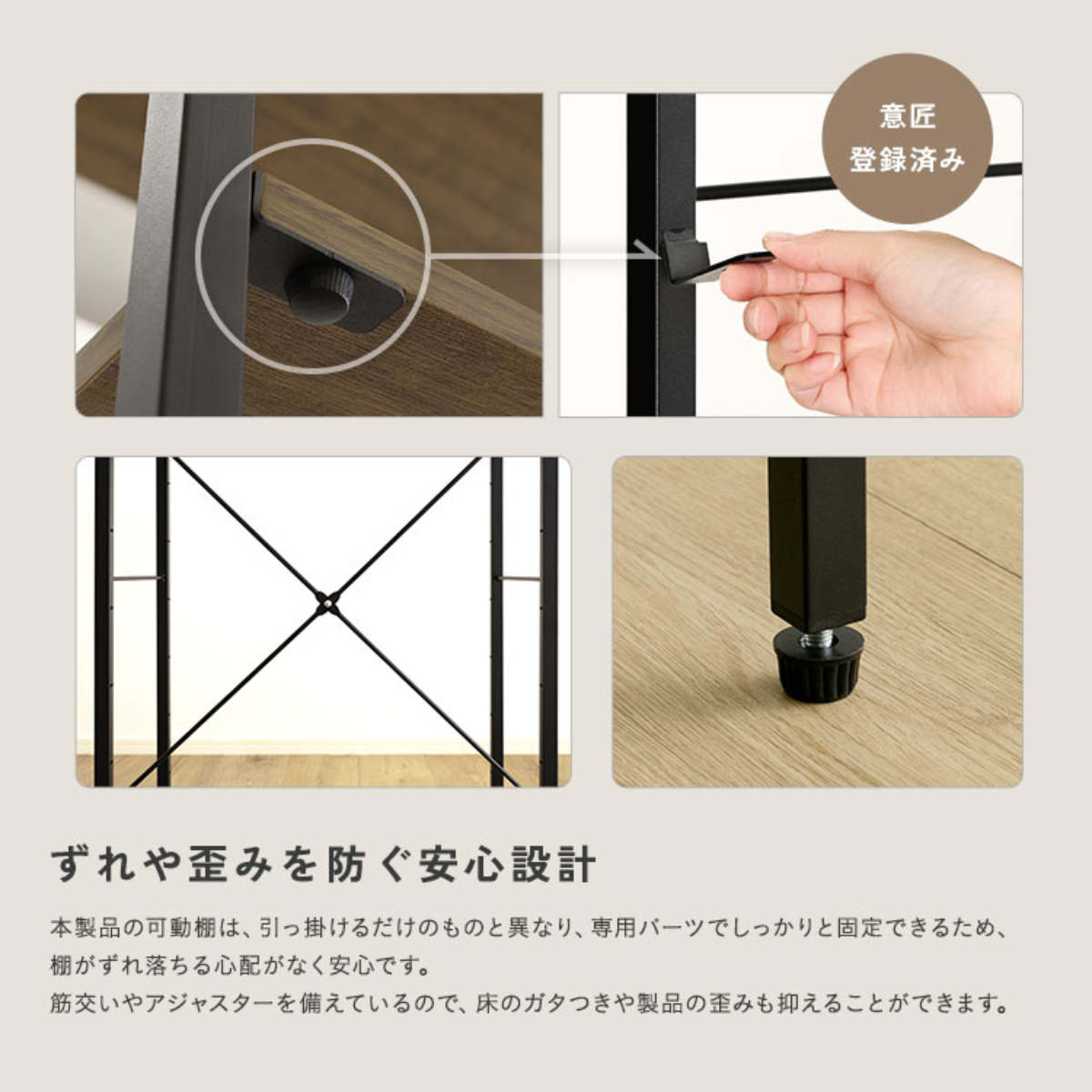 棚は引っ掛けるだけのものとは異なり、専用パーツでしっかりと固定するため、ずれ落ちる心配がなく安心です。また、アジャスターや背面クロスバー(筋交い)を備えているので、床のガタつきや製品の歪みを抑えることができます。