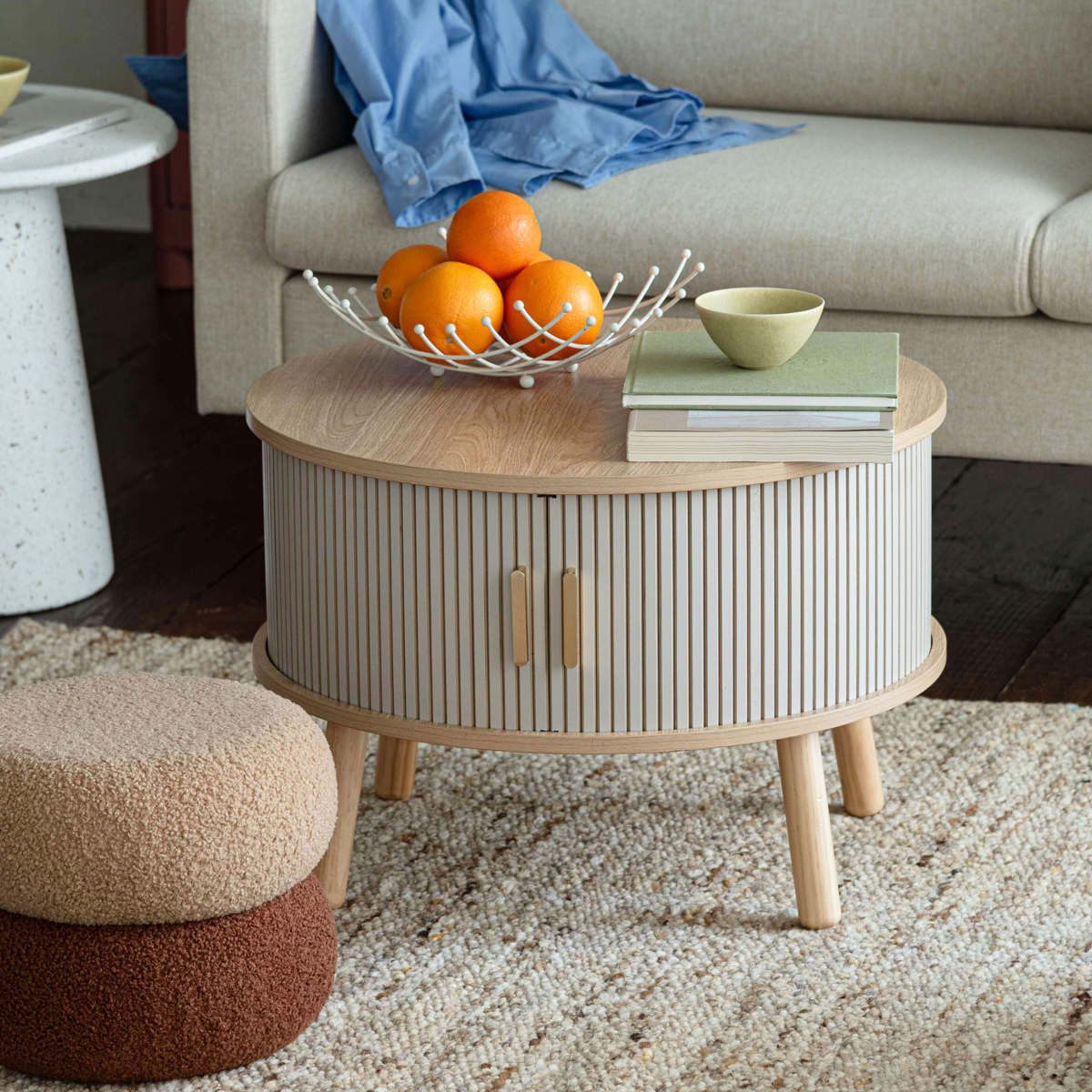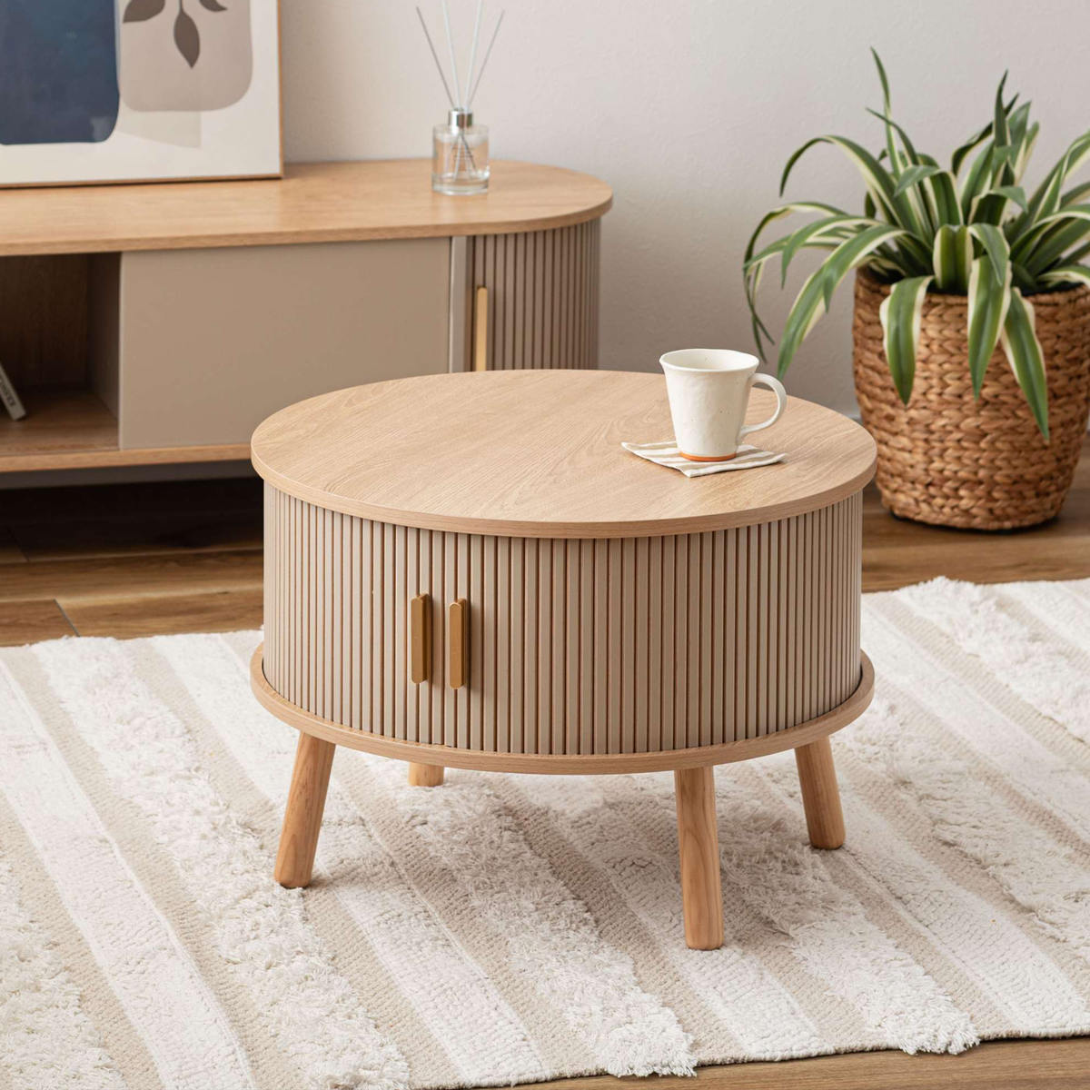 お部屋をスッキリ見せられる、収納付きリビングテーブルです。表情豊かなリブデザインの扉が、生活感の出やすい小物をおしゃれに隠します。
