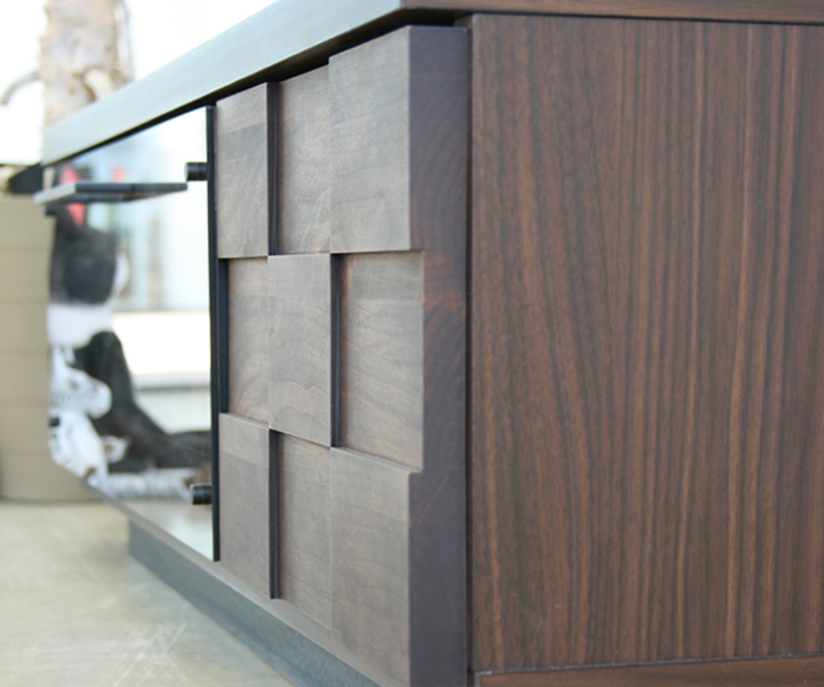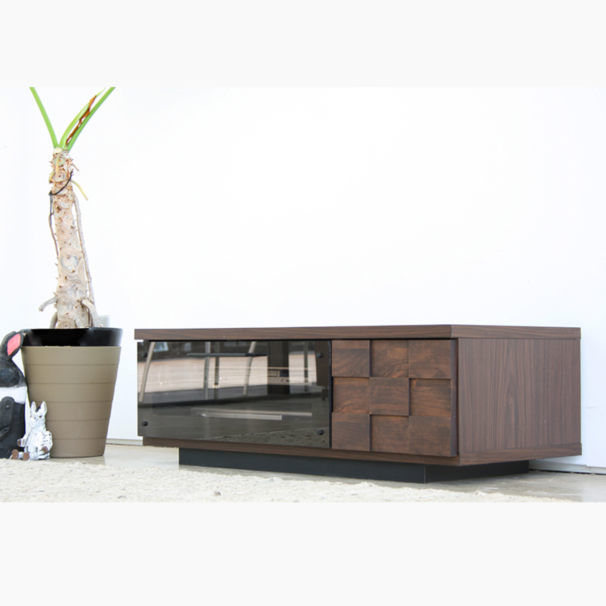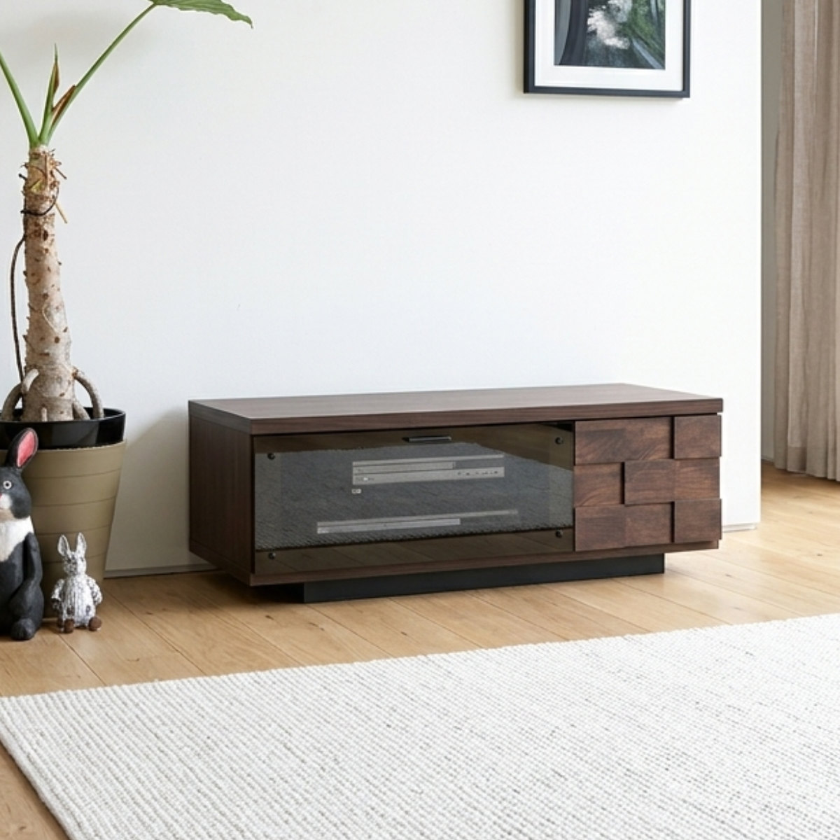 前板にはアルダー無垢材を使用し、厚みの異なる凹凸デザインが立体感のある表情を演出します。ダークグレーの強化ガラスと組み合わせることで、落ち着きのある上質な雰囲気に。空間をワンランク上へ引き上げます。