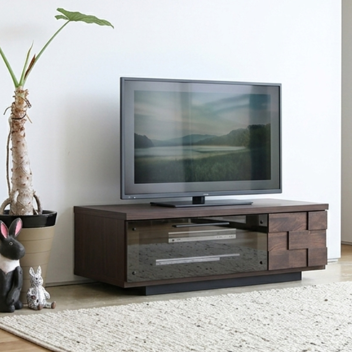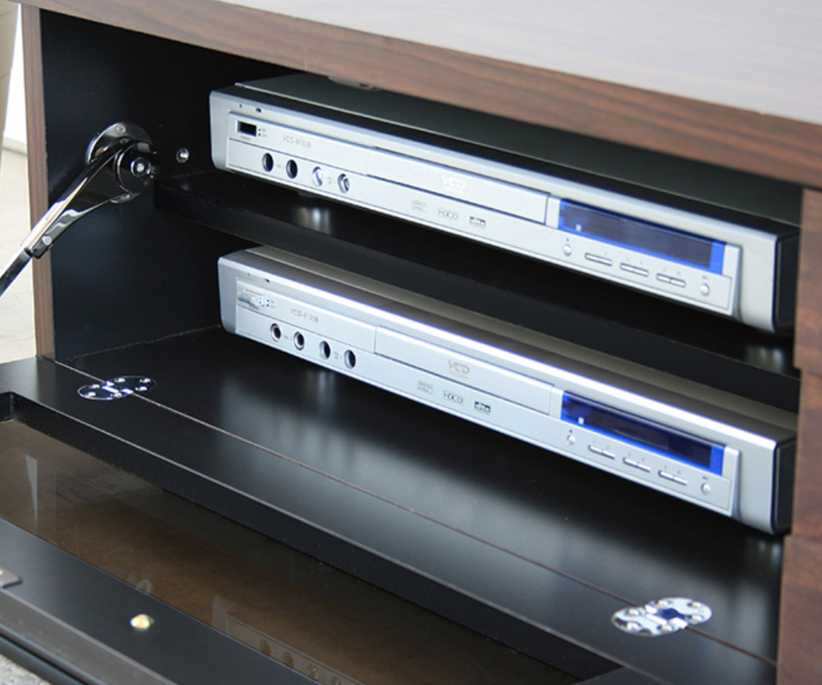 ほこりが入りにくいガラス扉は、取っ手を引くだけで開閉できるフラップ式です。扉を閉めたままでもリモコン操作が可能。内部は可動棚仕様で、収納物に合わせて高さ調節ができます。
