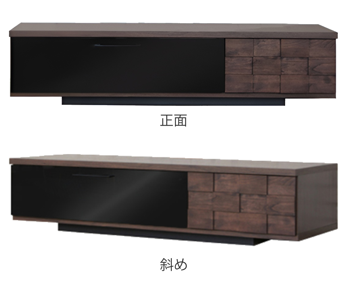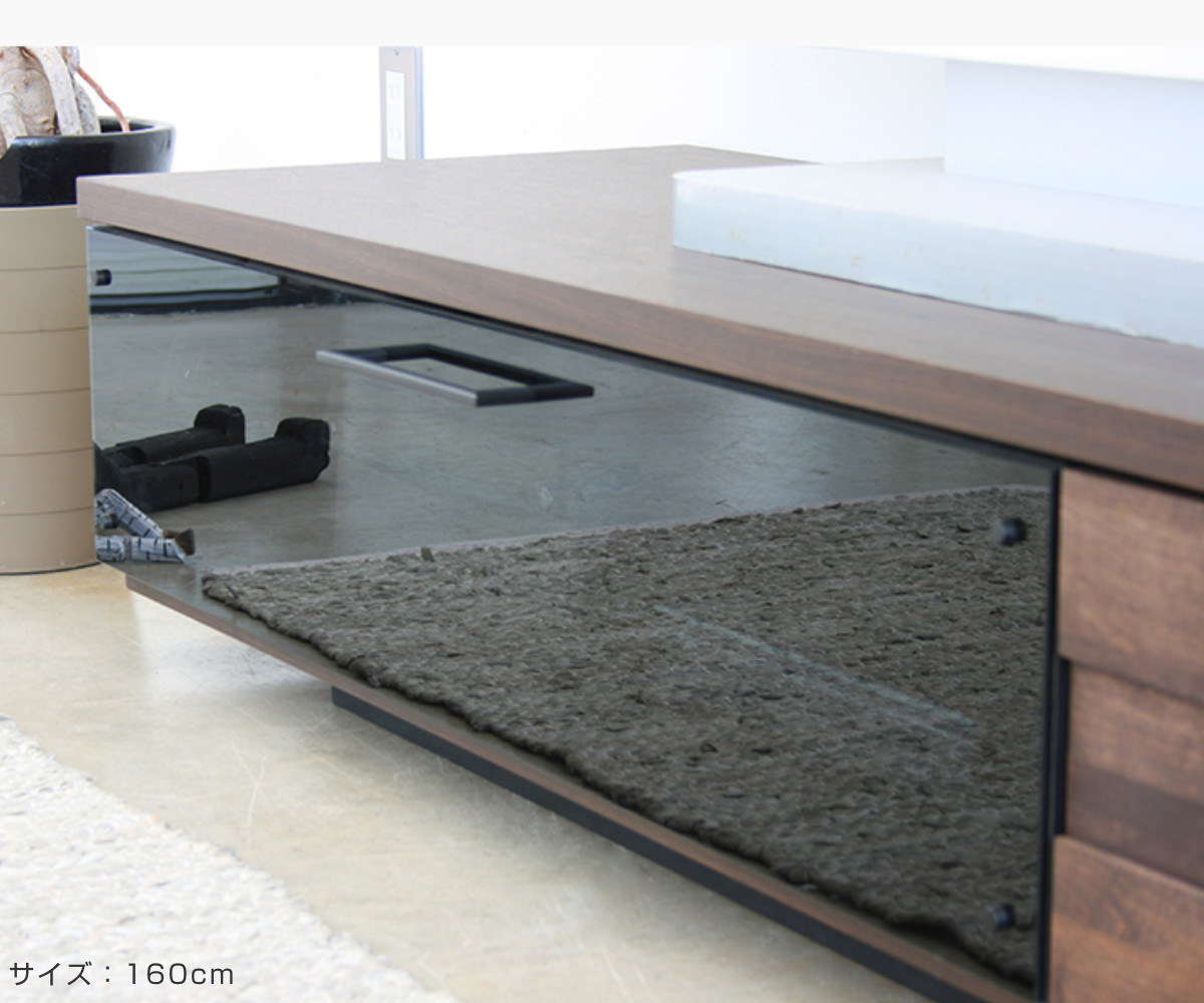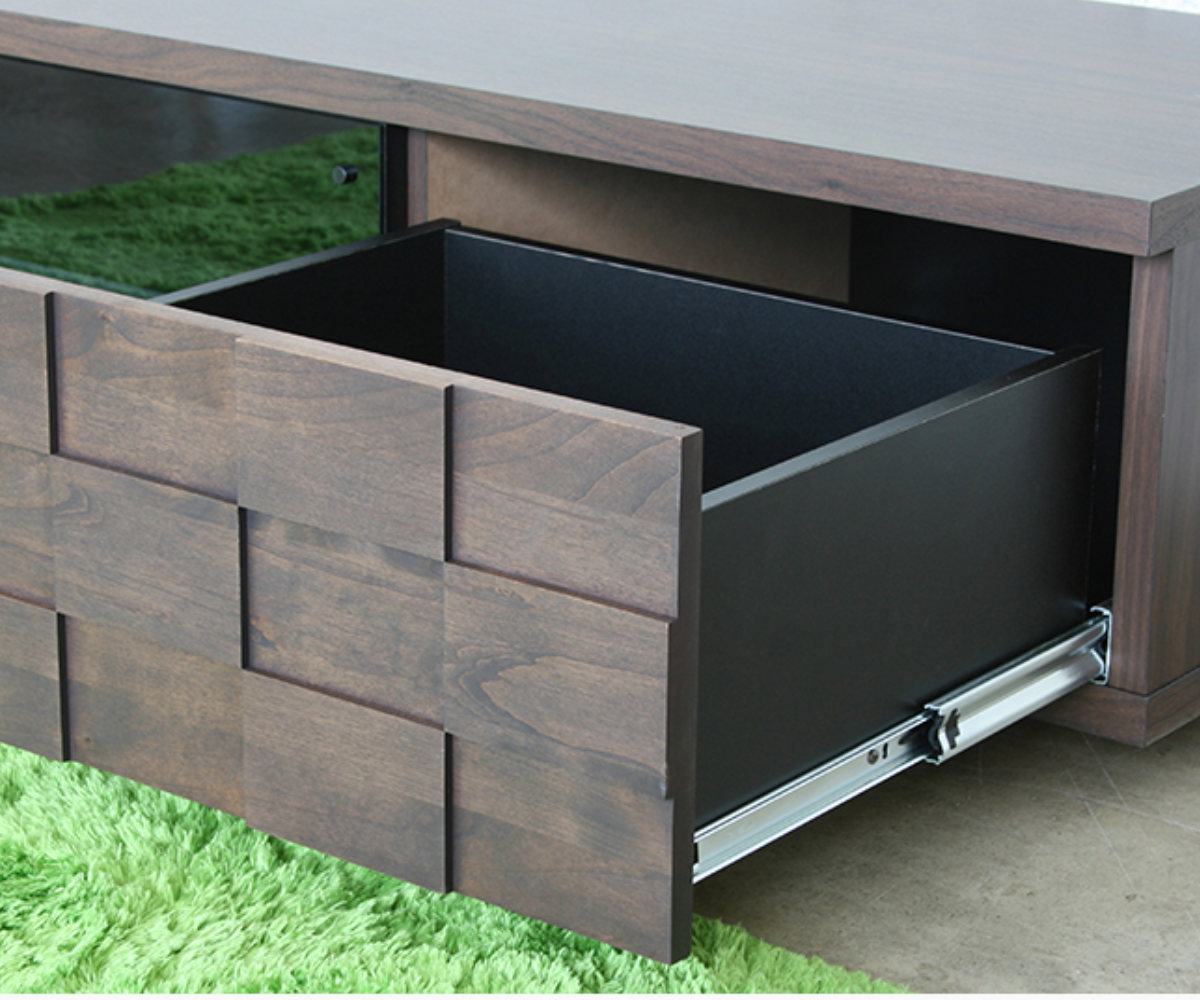 前板にはアルダー無垢材を使用し、厚みの異なる凹凸デザインが立体感のある表情を演出します。ダークグレーの強化ガラスと組み合わせることで、落ち着きのある上質な雰囲気に。空間をワンランク上へ引き上げます。