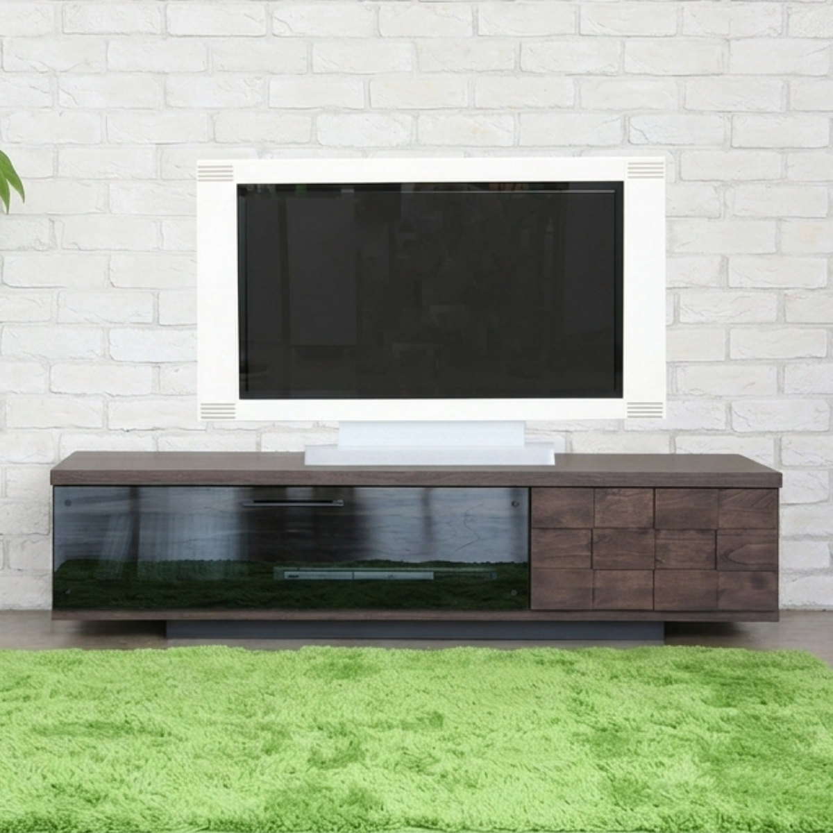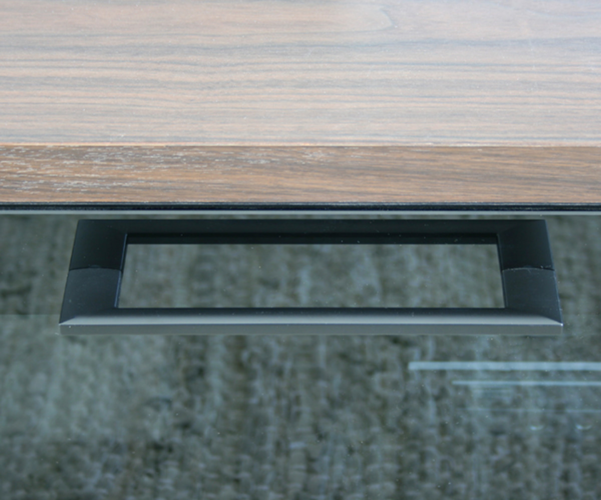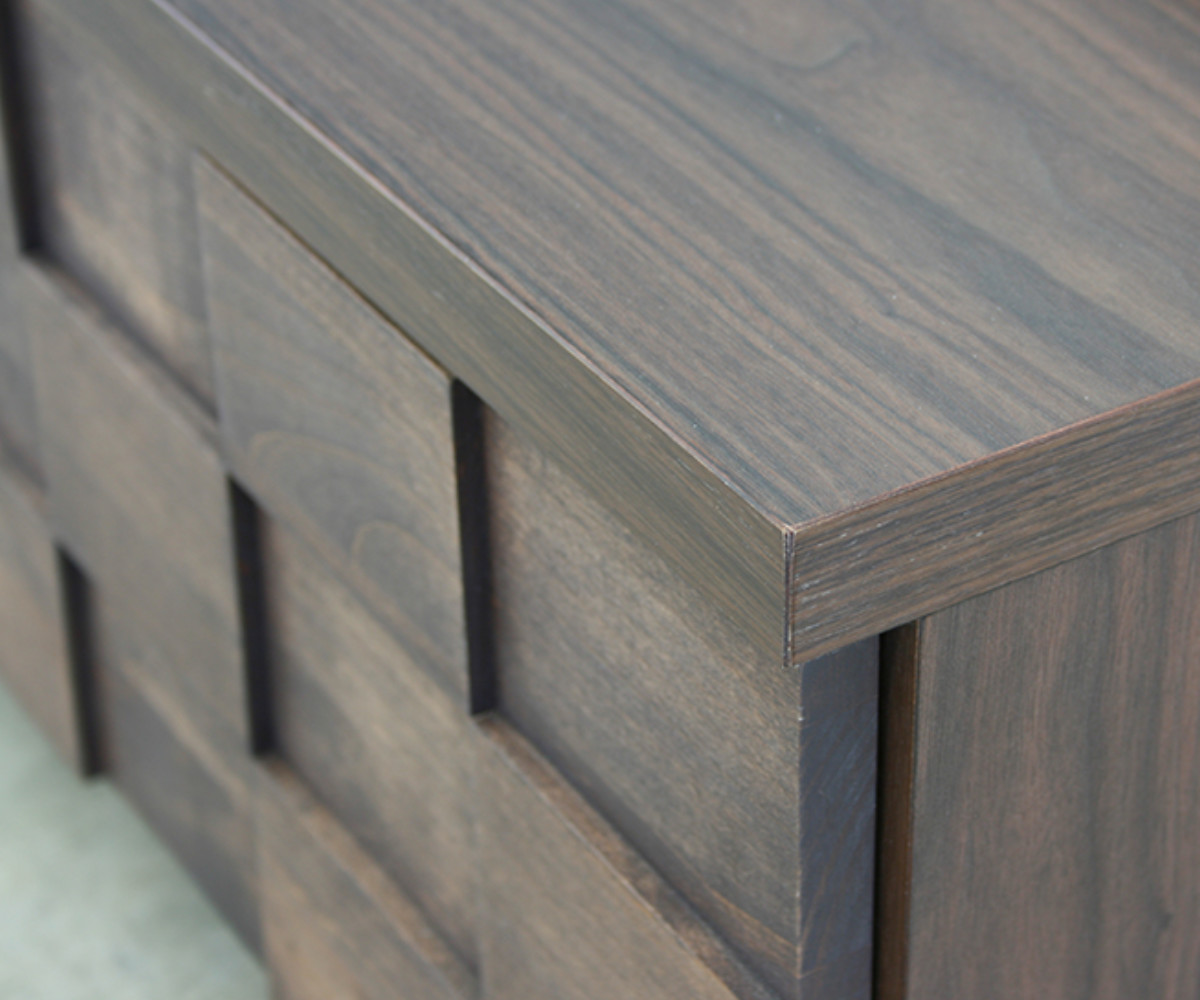 前板にはアルダー無垢材を使用し、厚みの異なる凹凸デザインが立体感のある表情を演出します。ダークグレーの強化ガラスと組み合わせることで、落ち着きのある上質な雰囲気に。空間をワンランク上へ引き上げます。