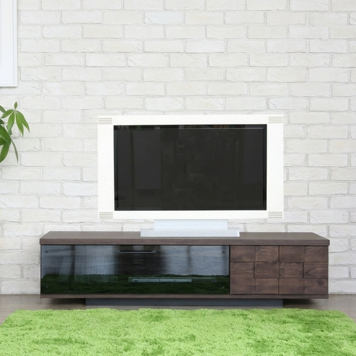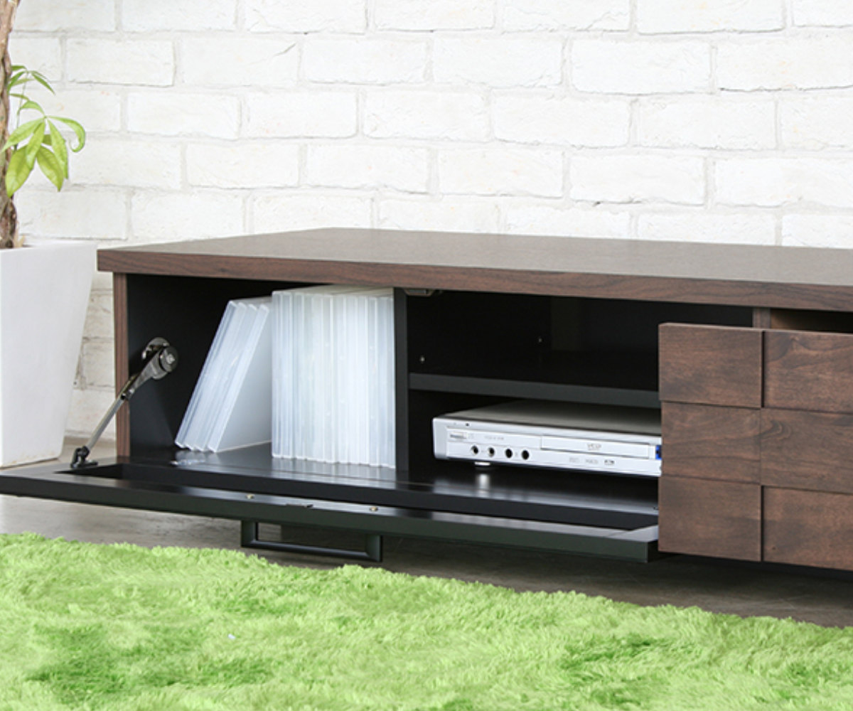 ほこりが入りにくいガラス扉は、取っ手を引くだけで開閉できるフラップ式です。扉を閉めたままでもリモコン操作が可能。内部は可動棚仕様で、収納物に合わせて高さ調節ができます。DVDやルーターを入れられるスペースもあります。