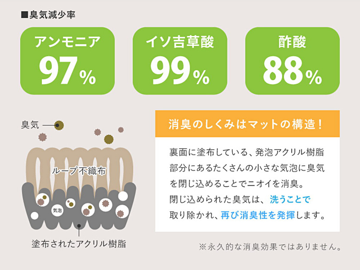 汗臭などのニオイの原因である臭気を閉じ込め消臭性を発揮。特別な消臭剤などは使用していないので安心です。