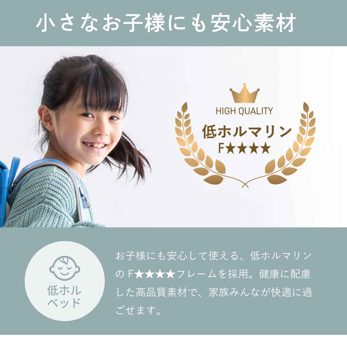 お子さまも安心の低ホルマリン・信頼の日本製